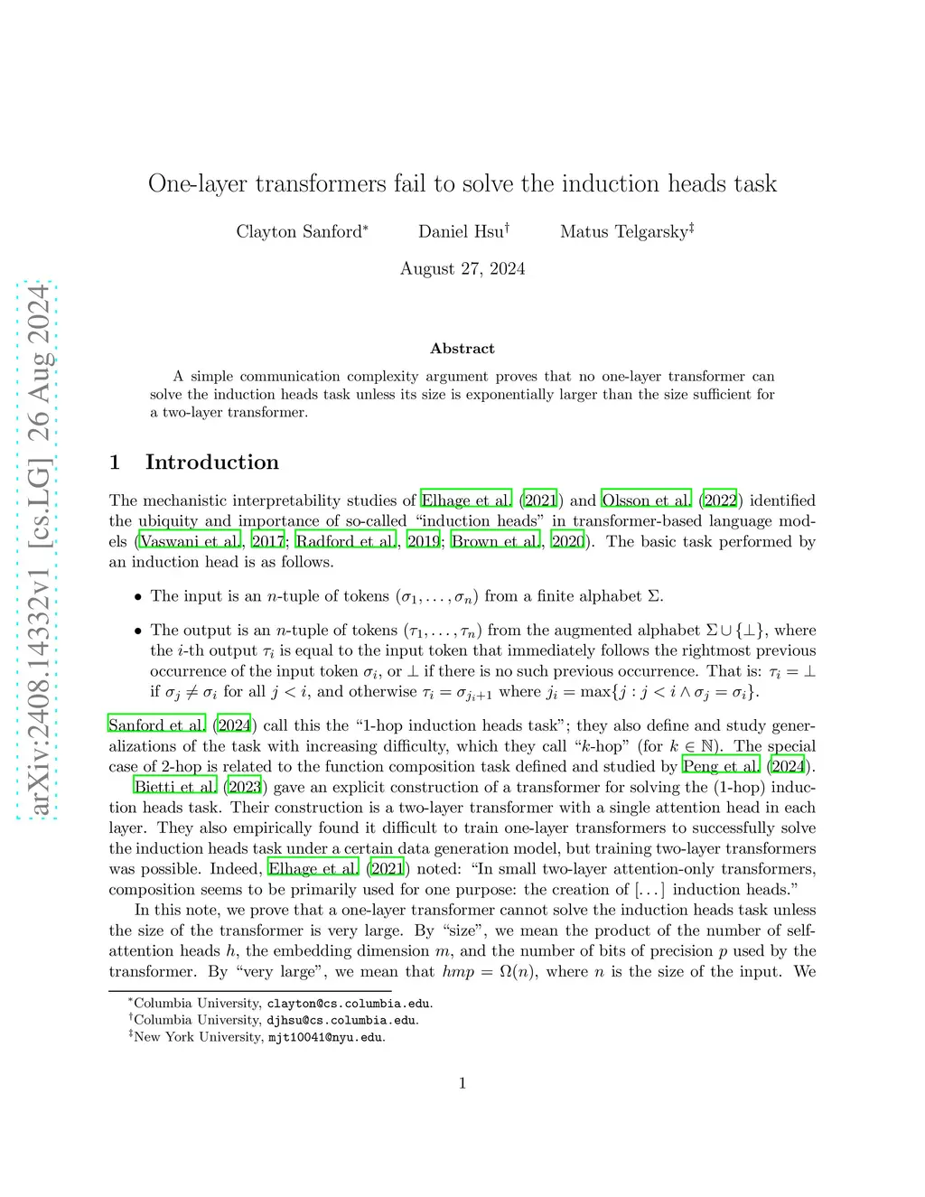 A simple communication complexity argument proves that no one-layer transformer can solve the induction heads task unless its size is exponentially larger than the size sufficient for a two-layer transformer.