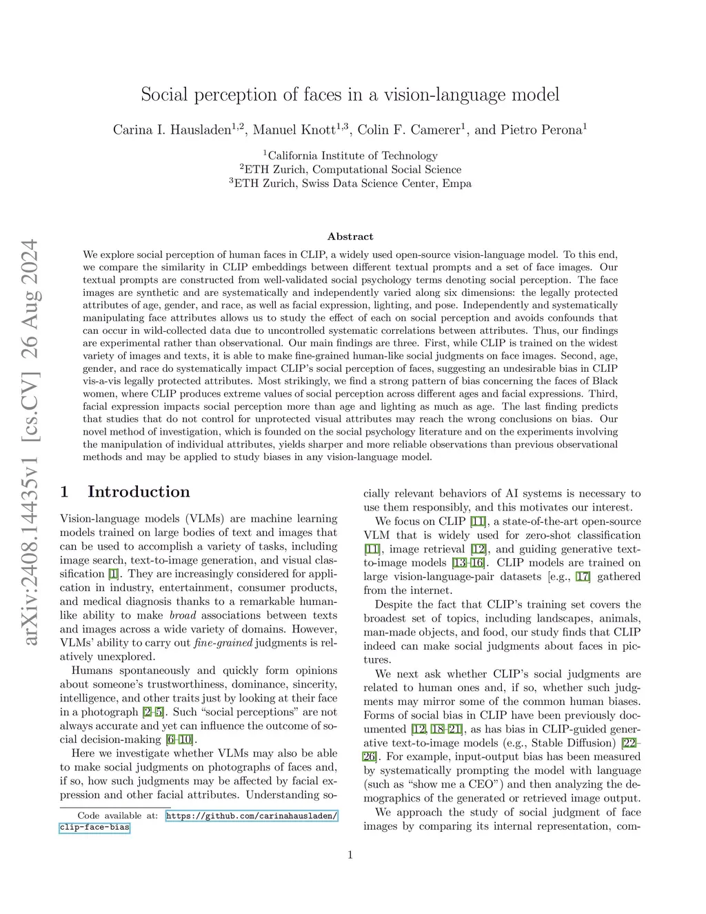 We explore social perception of human faces in CLIP, a widely used open-source vision-language model. To this end, we compare the similarity in CLIP embeddings between different textual prompts and a set of face images. Our textual prompts are constructed from well-validated social psychology terms denoting social perception. The face images are synthetic and are systematically and independently varied along six dimensions: the legally protected attributes of age, gender, and race, as well as facial expression, lighting, and pose. Independently and systematically manipulating face attributes allows us to study the effect of each on social perception and avoids confounds that can occur in wild-collected data due to uncontrolled systematic correlations between attributes. Thus, our findings are experimental rather than observational. Our main findings are three. First, while CLIP is trained on the widest variety of images and texts, it is able to make fine-grained human-like social judgments on face images. Second, age, gender, and race do systematically impact CLIP's social perception of faces, suggesting an undesirable bias in CLIP vis-a-vis legally protected attributes. Most strikingly, we find a strong pattern of bias concerning the faces of Black women, where CLIP produces extreme values of social perception across different ages and facial expressions. Third, facial expression impacts social perception more than age and lighting as much as age. The last finding predicts that studies that do not control for unprotected visual attributes may reach the wrong conclusions on bias. Our novel method of investigation, which is founded on the social psychology literature and on the experiments involving the manipulation of individual attributes, yields sharper and more reliable observations than previous observational methods and may be applied to study biases in any vision-language model.
