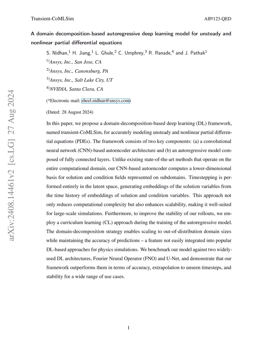 In this paper, we propose a domain-decomposition-based deep learning (DL) framework, named transient-CoMLSim, for accurately modeling unsteady and nonlinear partial differential equations (PDEs). The framework consists of two key components: (a) a convolutional neural network (CNN)-based autoencoder architecture and (b) an autoregressive model composed of fully connected layers. Unlike existing state-of-the-art methods that operate on the entire computational domain, our CNN-based autoencoder computes a lower-dimensional basis for solution and condition fields represented on subdomains. Timestepping is performed entirely in the latent space, generating embeddings of the solution variables from the time history of embeddings of solution and condition variables. This approach not only reduces computational complexity but also enhances scalability, making it well-suited for large-scale simulations. Furthermore, to improve the stability of our rollouts, we employ a curriculum learning (CL) approach during the training of the autoregressive model. The domain-decomposition strategy enables scaling to out-of-distribution domain sizes while maintaining the accuracy of predictions -- a feature not easily integrated into popular DL-based approaches for physics simulations. We benchmark our model against two widely-used DL architectures, Fourier Neural Operator (FNO) and U-Net, and demonstrate that our framework outperforms them in terms of accuracy, extrapolation to unseen timesteps, and stability for a wide range of use cases.