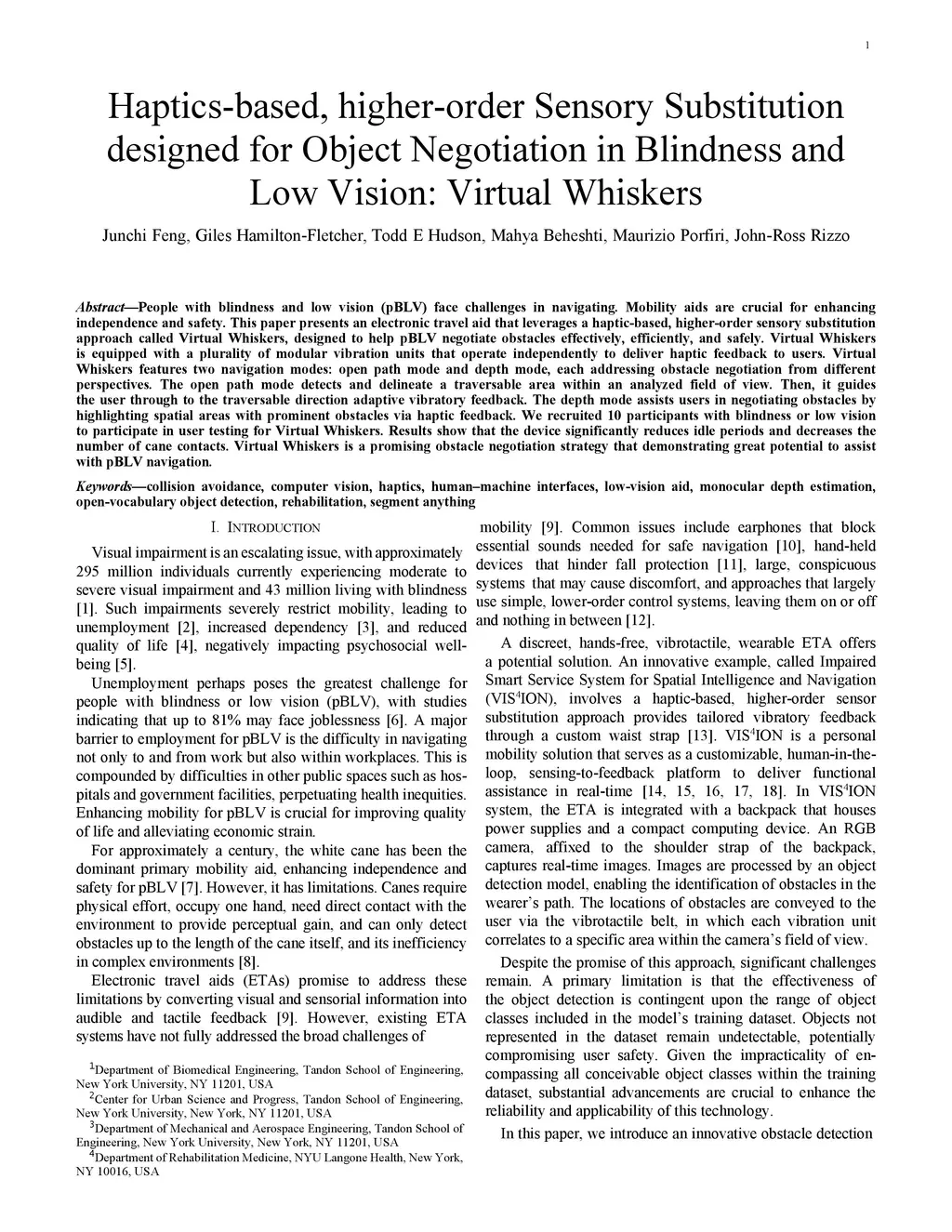 People with blindness and low vision (pBLV) face challenges in navigating. Mobility aids are crucial for enhancing independence and safety. This paper presents an electronic travel aid that leverages a haptic-based, higher-order sensory substitution approach called Virtual Whiskers, designed to help pBLV negotiate obstacles effectively, efficiently, and safely. Virtual Whiskers is equipped with a plurality of modular vibration units that operate independently to deliver haptic feedback to users. Virtual Whiskers features two navigation modes: open path mode and depth mode, each addressing obstacle negotiation from different perspectives. The open path mode detects and delineate a traversable area within an analyzed field of view. Then, it guides the user through to the traversable direction adaptive vibratory feedback. The depth mode assists users in negotiating obstacles by highlighting spatial areas with prominent obstacles via haptic feedback. We recruited 10 participants with blindness or low vision to participate in user testing for Virtual Whiskers. Results show that the device significantly reduces idle periods and decreases the number of cane contacts. Virtual Whiskers is a promising obstacle negotiation strategy that demonstrating great potential to assist with pBLV navigation.