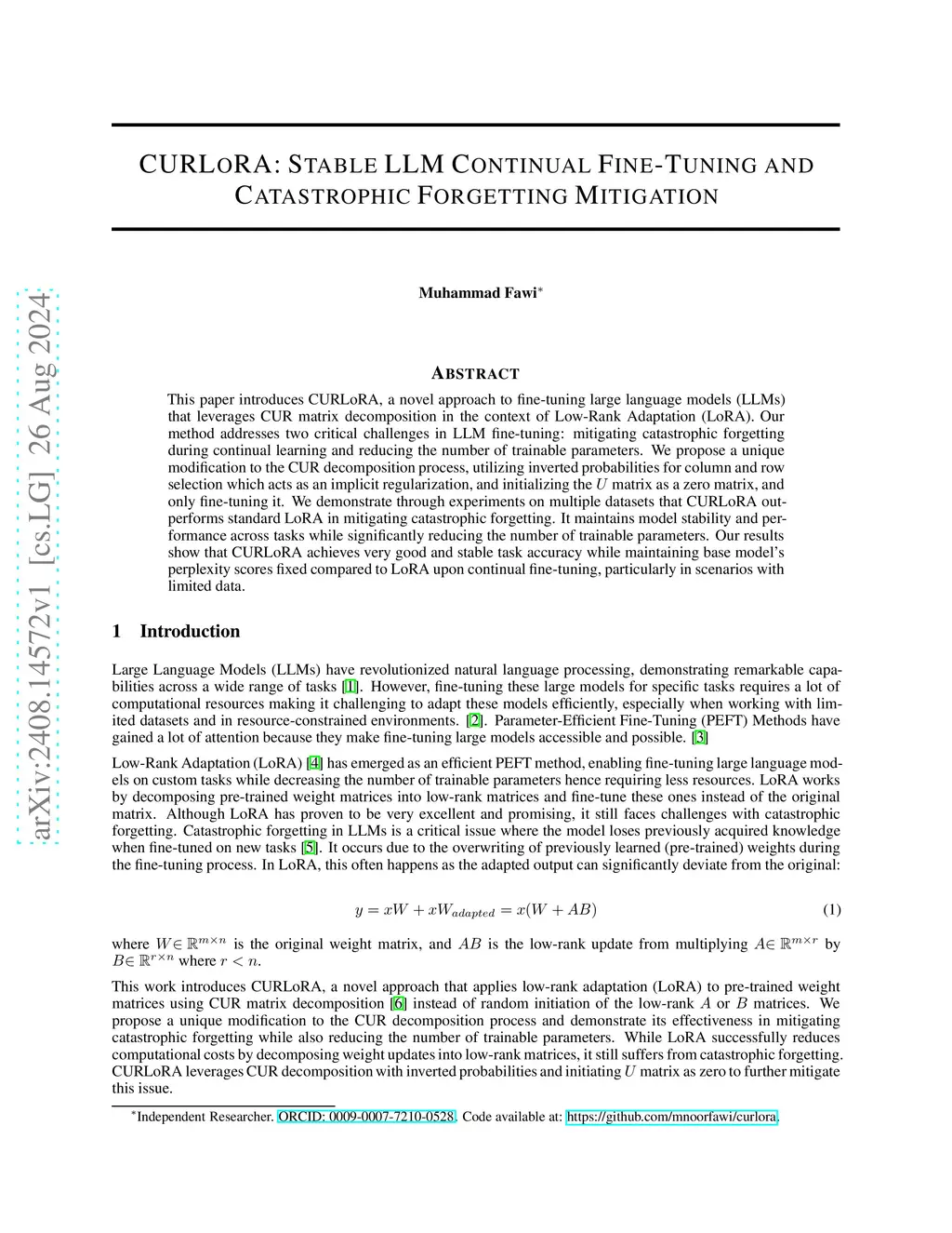 This paper introduces CURLoRA, a novel approach to fine-tuning large language models (LLMs) that leverages CUR matrix decomposition in the context of Low-Rank Adaptation (LoRA). Our method addresses two critical challenges in LLM fine-tuning: mitigating catastrophic forgetting during continual learning and reducing the number of trainable parameters. We propose a unique modification to the CUR decomposition process, utilizing inverted probabilities for column and row selection which acts as an implicit regularization, and initializing the matrix as a zero matrix, and only fine-tuning it. We demonstrate through experiments on multiple datasets that CURLoRA outperforms standard LoRA in mitigating catastrophic forgetting. It maintains model stability and performance across tasks while significantly reducing the number of trainable parameters. Our results show that CURLoRA achieves very good and stable task accuracy while maintaining base model's perplexity scores fixed compared to LoRA upon continual fine-tuning, particularly in scenarios with limited data.