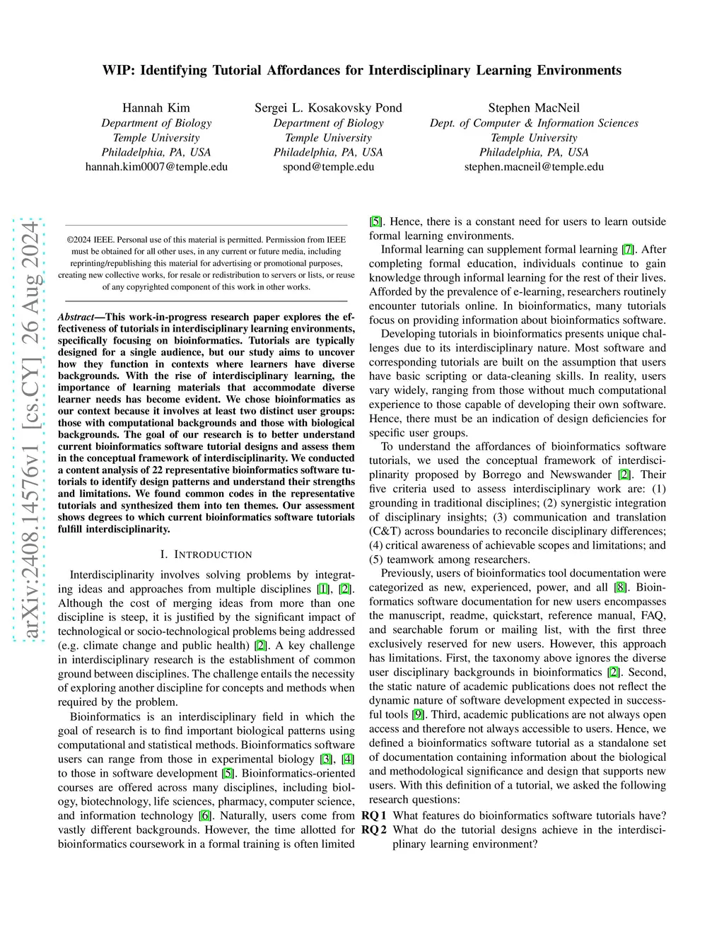 WIP: Identifying Tutorial Affordances for Interdisciplinary Learning