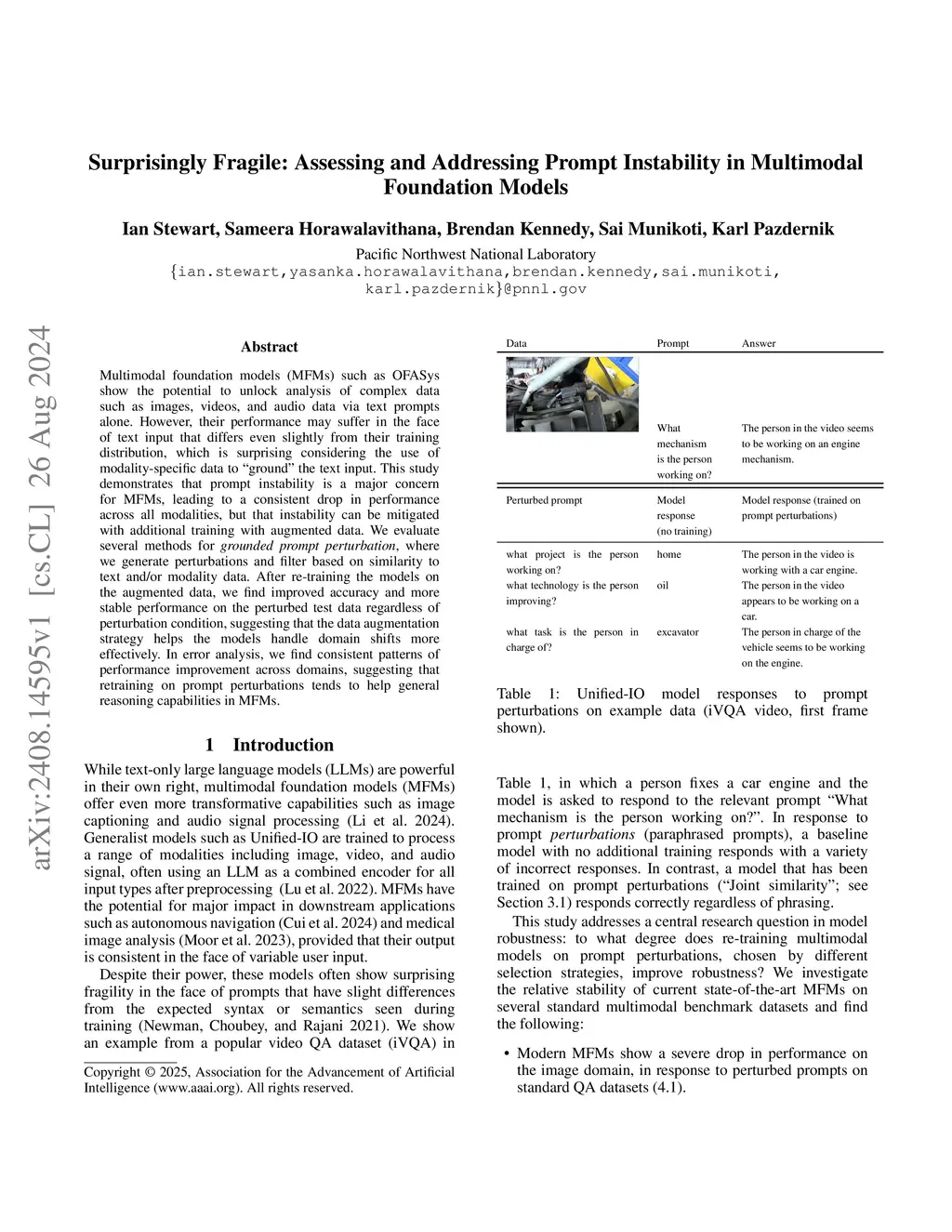 Multimodal foundation models (MFMs) such as OFASys show the potential to unlock analysis of complex data such as images, videos, and audio data via text prompts alone. However, their performance may suffer in the face of text input that differs even slightly from their training distribution, which is surprising considering the use of modality-specific data to "ground" the text input. This study demonstrates that prompt instability is a major concern for MFMs, leading to a consistent drop in performance across all modalities, but that instability can be mitigated with additional training with augmented data. We evaluate several methods for grounded prompt perturbation, where we generate perturbations and filter based on similarity to text and/or modality data. After re-training the models on the augmented data, we find improved accuracy and more stable performance on the perturbed test data regardless of perturbation condition, suggesting that the data augmentation strategy helps the models handle domain shifts more effectively. In error analysis, we find consistent patterns of performance improvement across domains, suggesting that retraining on prompt perturbations tends to help general reasoning capabilities in MFMs.