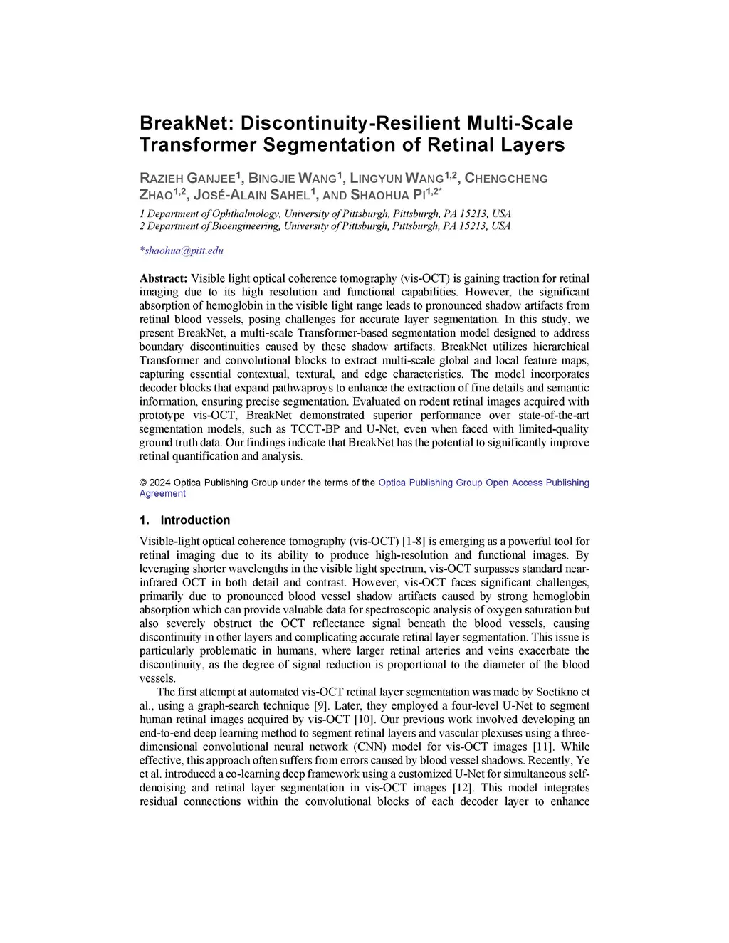 Visible light optical coherence tomography (vis-OCT) is gaining traction for retinal imaging due to its high resolution and functional capabilities. However, the significant absorption of hemoglobin in the visible light range leads to pronounced shadow artifacts from retinal blood vessels, posing challenges for accurate layer segmentation. In this study, we present BreakNet, a multi-scale Transformer-based segmentation model designed to address boundary discontinuities caused by these shadow artifacts. BreakNet utilizes hierarchical Transformer and convolutional blocks to extract multi-scale global and local feature maps, capturing essential contextual, textural, and edge characteristics. The model incorporates decoder blocks that expand pathwaproys to enhance the extraction of fine details and semantic information, ensuring precise segmentation. Evaluated on rodent retinal images acquired with prototype vis-OCT, BreakNet demonstrated superior performance over state-of-the-art segmentation models, such as TCCT-BP and U-Net, even when faced with limited-quality ground truth data. Our findings indicate that BreakNet has the potential to significantly improve retinal quantification and analysis.