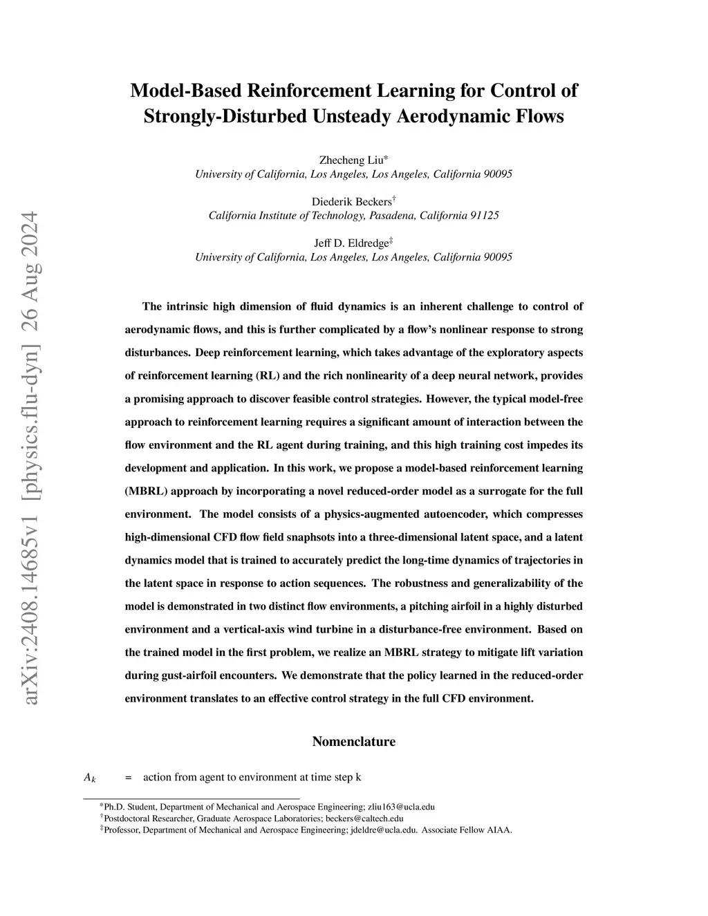 The intrinsic high dimension of fluid dynamics is an inherent challenge to control of aerodynamic flows, and this is further complicated by a flow's nonlinear response to strong disturbances. Deep reinforcement learning, which takes advantage of the exploratory aspects of reinforcement learning (RL) and the rich nonlinearity of a deep neural network, provides a promising approach to discover feasible control strategies. However, the typical model-free approach to reinforcement learning requires a significant amount of interaction between the flow environment and the RL agent during training, and this high training cost impedes its development and application. In this work, we propose a model-based reinforcement learning (MBRL) approach by incorporating a novel reduced-order model as a surrogate for the full environment. The model consists of a physics-augmented autoencoder, which compresses high-dimensional CFD flow field snaphsots into a three-dimensional latent space, and a latent dynamics model that is trained to accurately predict the long-time dynamics of trajectories in the latent space in response to action sequences. The accuracy and robustness of the model are demonstrated in the scenario of a pitching airfoil within a highly disturbed environment. Additionally, an application to a vertical-axis wind turbine in a disturbance-free environment is discussed in the Appendix Based on the model trained in the pitching airfoil problem, we realize an MBRL strategy to mitigate lift variation during gust-airfoil encounters. We demonstrate that the policy learned in the reduced-order environment translates to an effective control strategy in the full CFD environment.