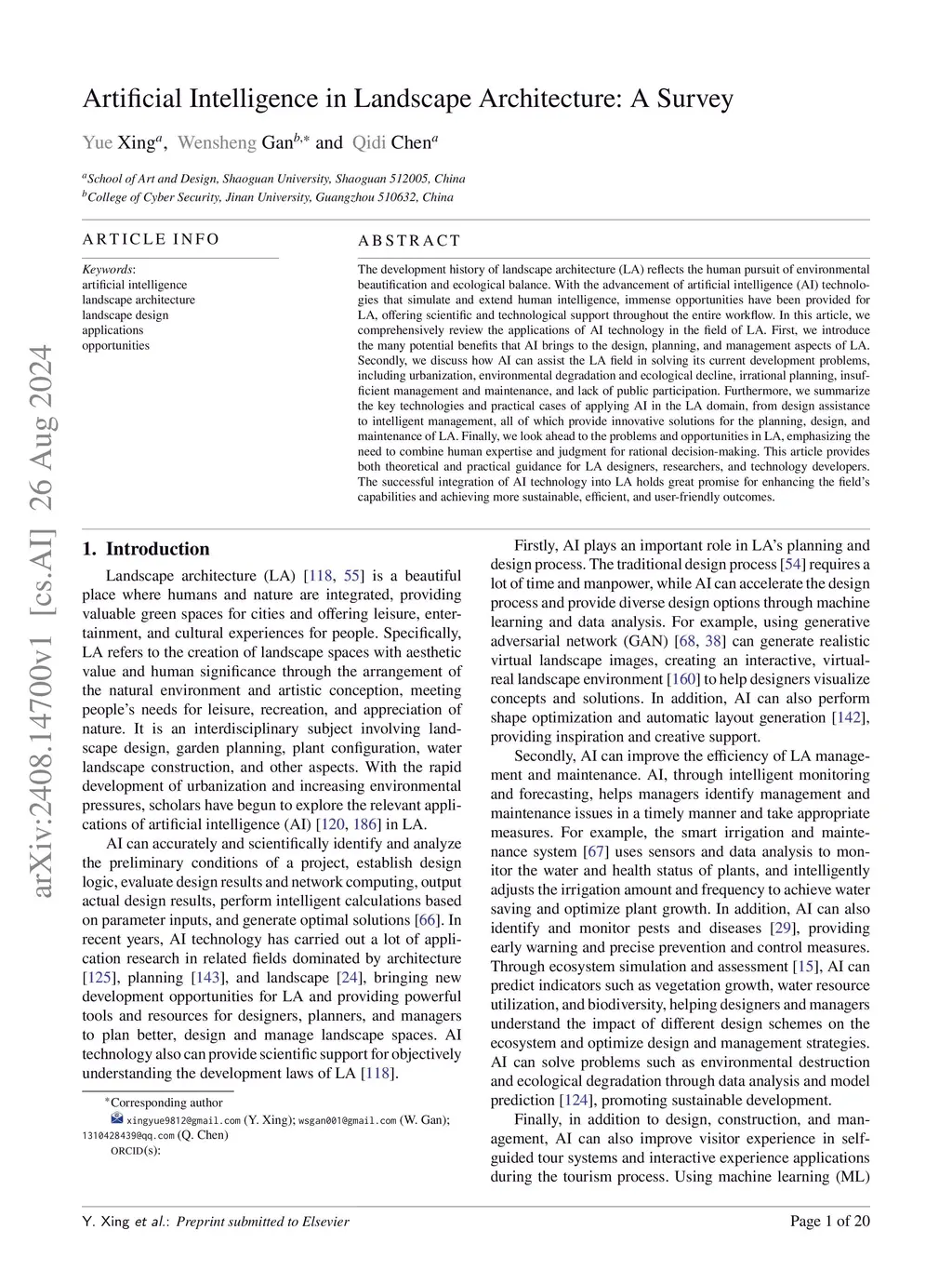 The development history of landscape architecture (LA) reflects the human pursuit of environmental beautification and ecological balance. With the advancement of artificial intelligence (AI) technologies that simulate and extend human intelligence, immense opportunities have been provided for LA, offering scientific and technological support throughout the entire workflow. In this article, we comprehensively review the applications of AI technology in the field of LA. First, we introduce the many potential benefits that AI brings to the design, planning, and management aspects of LA. Secondly, we discuss how AI can assist the LA field in solving its current development problems, including urbanization, environmental degradation and ecological decline, irrational planning, insufficient management and maintenance, and lack of public participation. Furthermore, we summarize the key technologies and practical cases of applying AI in the LA domain, from design assistance to intelligent management, all of which provide innovative solutions for the planning, design, and maintenance of LA. Finally, we look ahead to the problems and opportunities in LA, emphasizing the need to combine human expertise and judgment for rational decision-making. This article provides both theoretical and practical guidance for LA designers, researchers, and technology developers. The successful integration of AI technology into LA holds great promise for enhancing the field's capabilities and achieving more sustainable, efficient, and user-friendly outcomes.