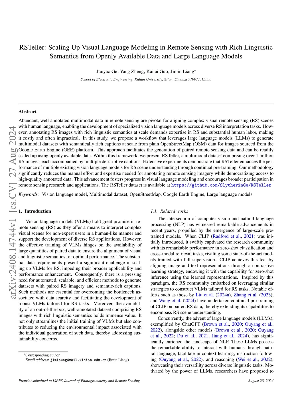 Abundant, well-annotated multimodal data in remote sensing are pivotal for aligning complex visual remote sensing (RS) scenes with human language, enabling the development of specialized vision language models across diverse RS interpretation tasks. However, annotating RS images with rich linguistic semantics at scale demands expertise in RS and substantial human labor, making it costly and often impractical. In this study, we propose a workflow that leverages large language models (LLMs) to generate multimodal datasets with semantically rich captions at scale from plain OpenStreetMap (OSM) data for images sourced from the Google Earth Engine (GEE) platform. This approach facilitates the generation of paired remote sensing data and can be readily scaled up using openly available data. Within this framework, we present RSTeller, a multimodal dataset comprising over 1.3 million RS images, each accompanied by two descriptive captions. Extensive experiments demonstrate that RSTeller enhances the performance of multiple existing vision language models for RS scene understanding through continual pre-training. Our methodology significantly reduces the manual effort and expertise needed for annotating remote sensing imagery while democratizing access to high-quality annotated data. This advancement fosters progress in visual language modeling and encourages broader participation in remote sensing research and applications. The RSTeller dataset is available atthis https URL.