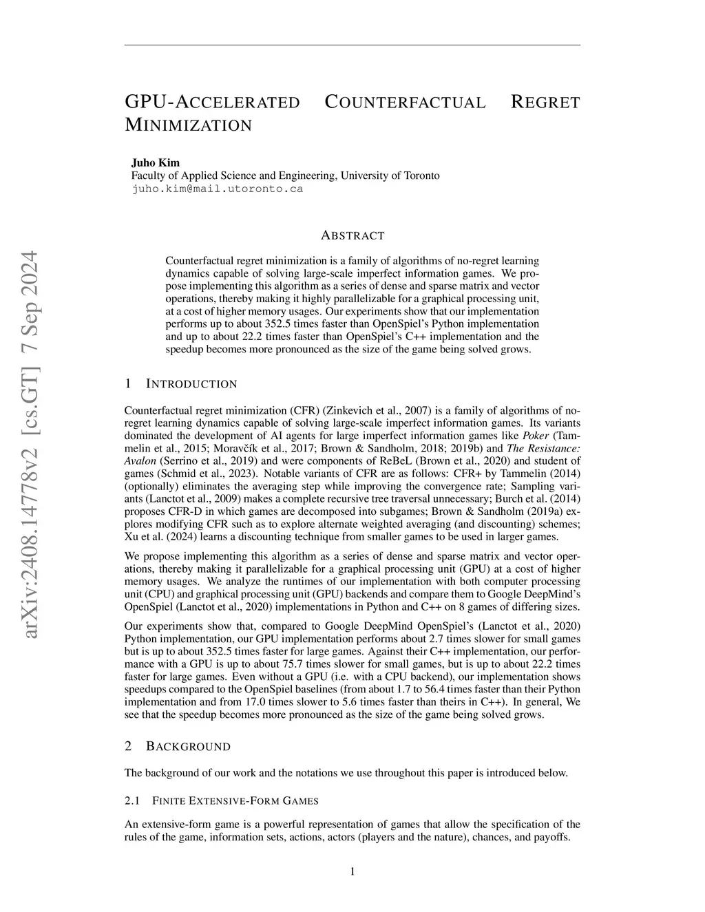 Counterfactual regret minimization is a family of algorithms of no-regret learning dynamics capable of solving large-scale imperfect information games. We propose implementing this algorithm as a series of dense and sparse matrix and vector operations, thereby making it highly parallelizable for a graphical processing unit, at a cost of higher memory usages. Our experiments show that our implementation performs up to about 352.5 times faster than OpenSpiel's Python implementation and up to about 22.2 times faster than OpenSpiel's C++ implementation and the speedup becomes more pronounced as the size of the game being solved grows.