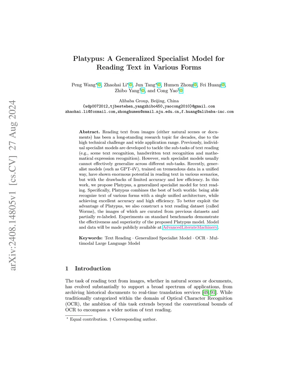 Platypus: A Generalized Specialist Model for Reading Text in Various