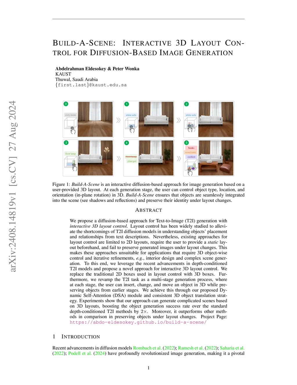 We propose a diffusion-based approach for Text-to-Image (T2I) generation with interactive 3D layout control. Layout control has been widely studied to alleviate the shortcomings of T2I diffusion models in understanding objects' placement and relationships from text descriptions. Nevertheless, existing approaches for layout control are limited to 2D layouts, require the user to provide a static layout beforehand, and fail to preserve generated images under layout changes. This makes these approaches unsuitable for applications that require 3D object-wise control and iterative refinements, e.g., interior design and complex scene generation. To this end, we leverage the recent advancements in depth-conditioned T2I models and propose a novel approach for interactive 3D layout control. We replace the traditional 2D boxes used in layout control with 3D boxes. Furthermore, we revamp the T2I task as a multi-stage generation process, where at each stage, the user can insert, change, and move an object in 3D while preserving objects from earlier stages. We achieve this through our proposed Dynamic Self-Attention (DSA) module and the consistent 3D object translation strategy. Experiments show that our approach can generate complicated scenes based on 3D layouts, boosting the object generation success rate over the standard depth-conditioned T2I methods by 2x. Moreover, it outperforms other methods in comparison in preserving objects under layout changes. Project Page: \url{https://abdo-eldesokey.github.io/build-a-scene/}