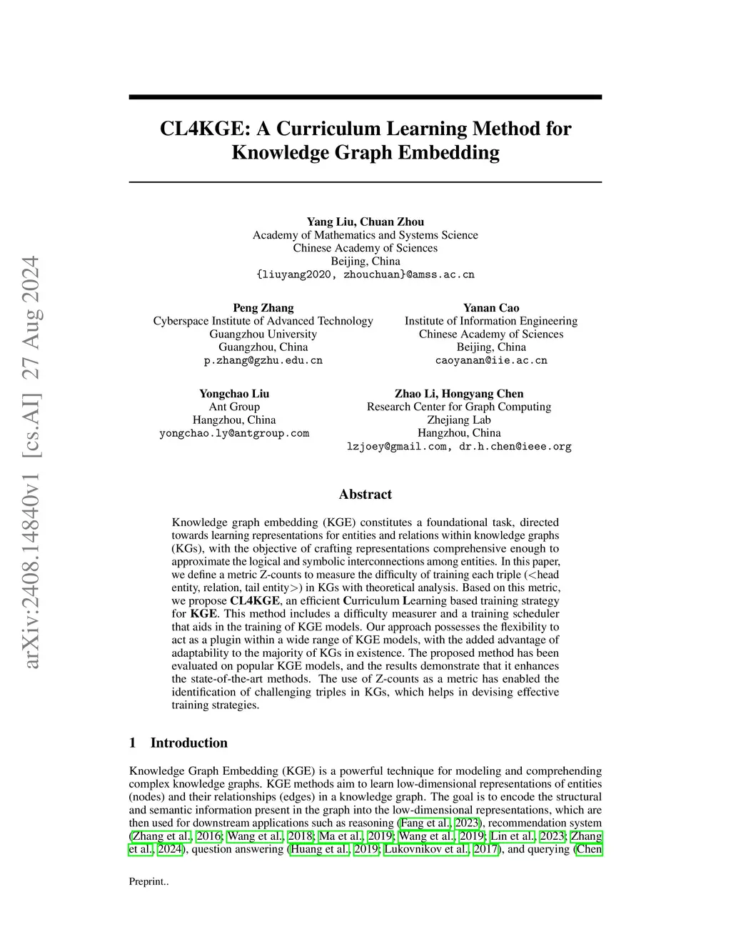 Knowledge graph embedding (KGE) constitutes a foundational task, directed towards learning representations for entities and relations within knowledge graphs (KGs), with the objective of crafting representations comprehensive enough to approximate the logical and symbolic interconnections among entities. In this paper, we define a metric Z-counts to measure the difficulty of training each triple (head entity, relation, tail entity) in KGs with theoretical analysis. Based on this metric, we propose \textbf{CL4KGE}, an efficient \textbf{C}urriculum \textbf{L}earning based training strategy for \textbf{KGE}. This method includes a difficulty measurer and a training scheduler that aids in the training of KGE models. Our approach possesses the flexibility to act as a plugin within a wide range of KGE models, with the added advantage of adaptability to the majority of KGs in existence. The proposed method has been evaluated on popular KGE models, and the results demonstrate that it enhances the state-of-the-art methods. The use of Z-counts as a metric has enabled the identification of challenging triples in KGs, which helps in devising effective training strategies.