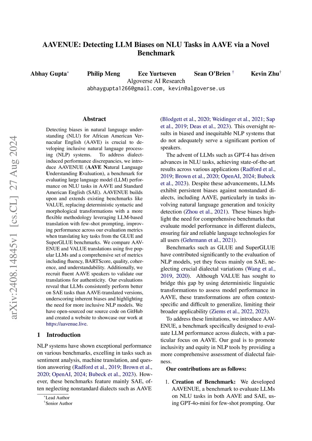 AAVENUE: Detecting LLM Biases on NLU Tasks in AAVE via a Novel Benchmark