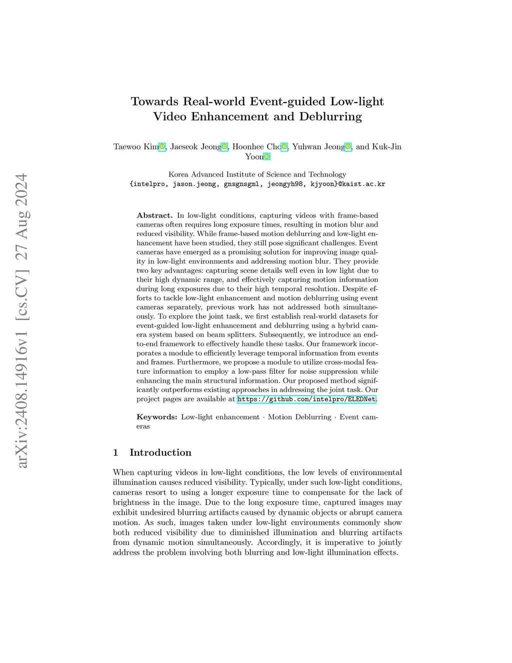 In low-light conditions, capturing videos with frame-based cameras often requires long exposure times, resulting in motion blur and reduced visibility. While frame-based motion deblurring and low-light enhancement have been studied, they still pose significant challenges. Event cameras have emerged as a promising solution for improving image quality in low-light environments and addressing motion blur. They provide two key advantages: capturing scene details well even in low light due to their high dynamic range, and effectively capturing motion information during long exposures due to their high temporal resolution. Despite efforts to tackle low-light enhancement and motion deblurring using event cameras separately, previous work has not addressed both simultaneously. To explore the joint task, we first establish real-world datasets for event-guided low-light enhancement and deblurring using a hybrid camera system based on beam splitters. Subsequently, we introduce an end-to-end framework to effectively handle these tasks. Our framework incorporates a module to efficiently leverage temporal information from events and frames. Furthermore, we propose a module to utilize cross-modal feature information to employ a low-pass filter for noise suppression while enhancing the main structural information. Our proposed method significantly outperforms existing approaches in addressing the joint task. Our project pages are available at https://github.com/intelpro/ELEDNet.