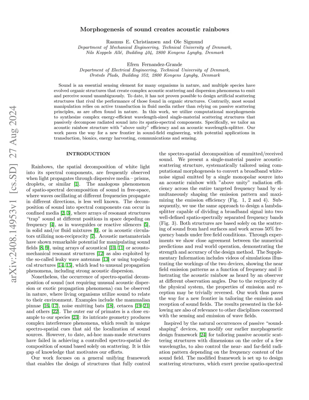 Sound is an essential sensing element for many organisms in nature, and multiple species have evolved organic structures that create complex acoustic scattering and dispersion phenomena to emit and perceive sound unambiguously. To date, it has not proven possible to design artificial scattering structures that rival the performance of those found in organic structures. Contrarily, most sound manipulation relies on active transduction in fluid media rather than relying on passive scattering principles, as are often found in nature. In this work, we utilize computational morphogenesis to synthesize complex energy-efficient wavelength-sized single-material scattering structures that passively decompose radiated sound into its spatio-spectral components. Specifically, we tailor an acoustic rainbow structure with "above unity" efficiency and an acoustic wavelength-splitter. Our work paves the way for a new frontier in sound-field engineering, with potential applications in transduction, bionics, energy harvesting, communications and sensing.