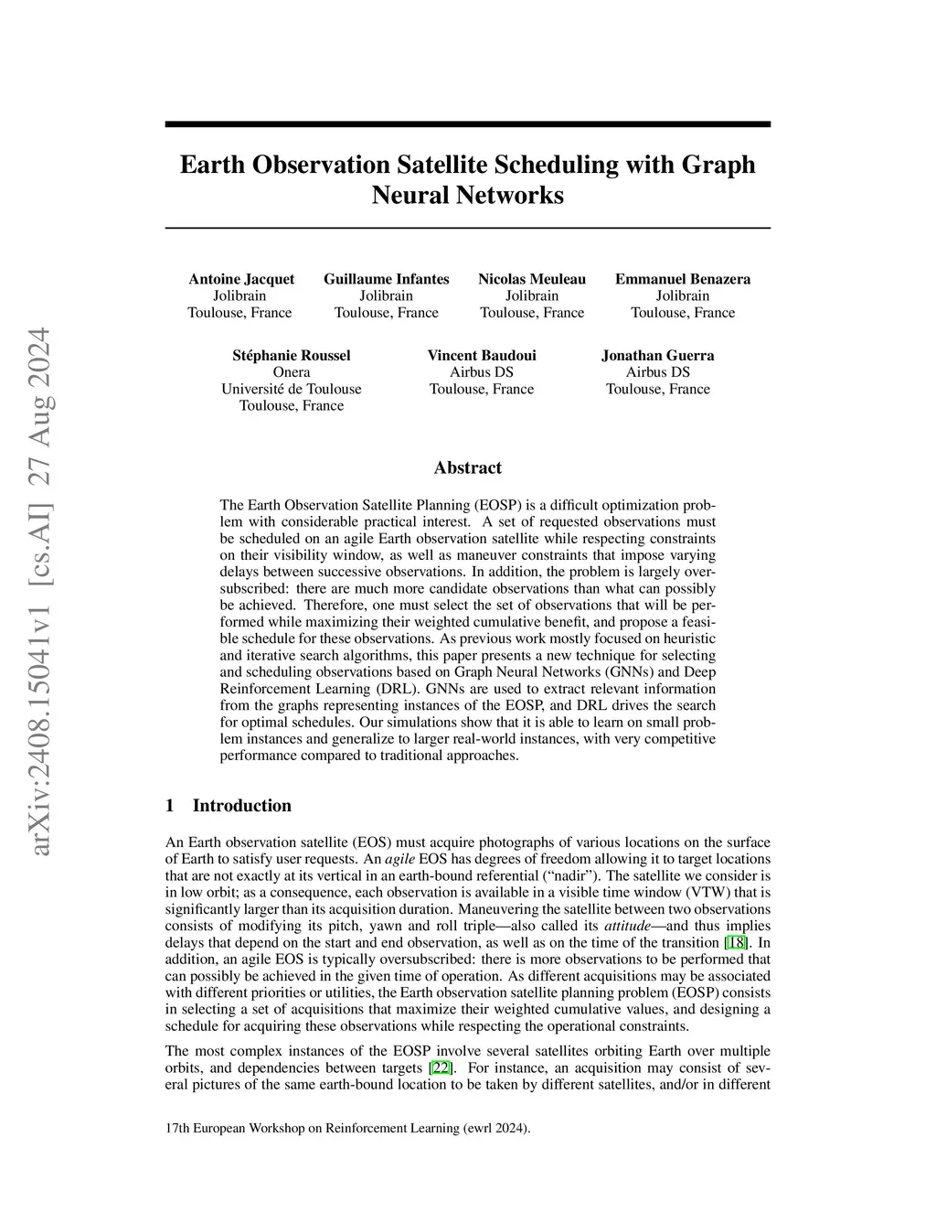 Earth Observation Satellite Planning (EOSP) is a difficult optimization problem with considerable practical interest. A set of requested observations must be scheduled on an agile Earth observation satellite while respecting constraints on their visibility window, as well as maneuver constraints that impose varying delays between successive observations. In addition, the problem is largely oversubscribed: there are much more candidate observations than can possibly be achieved. Therefore, one must select the set of observations that will be performed while maximizing their cumulative benefit and propose a feasible schedule for these observations. As previous work mostly focused on heuristic and iterative search algorithms, this paper presents a new technique for selecting and scheduling observations based on Graph Neural Networks (GNNs) and Deep Reinforcement Learning (DRL). GNNs are used to extract relevant information from the graphs representing instances of the EOSP, and DRL drives the search for optimal schedules. A post-learning search step based on Monte Carlo Tree Search (MCTS) is added that is able to find even better solutions. Experiments show that it is able to learn on small problem instances and generalize to larger real-world instances, with very competitive performance compared to traditional approaches.