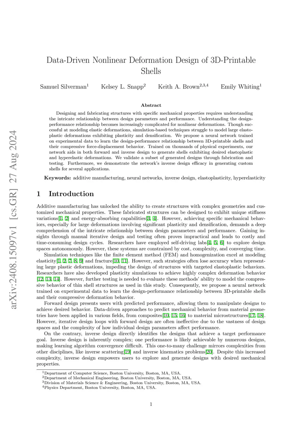 Designing and fabricating structures with specific mechanical properties requires understanding the intricate relationship between design parameters and performance. Understanding the design-performance relationship becomes increasingly complicated for nonlinear deformations. Though successful at modeling elastic deformations, simulation-based techniques struggle to model large elastoplastic deformations exhibiting plasticity and densification. We propose a neural network trained on experimental data to learn the design-performance relationship between 3D-printable shells and their compressive force-displacement behavior. Trained on thousands of physical experiments, our network aids in both forward and inverse design to generate shells exhibiting desired elastoplastic and hyperelastic deformations. We validate a subset of generated designs through fabrication and testing. Furthermore, we demonstrate the network's inverse design efficacy in generating custom shells for several applications.