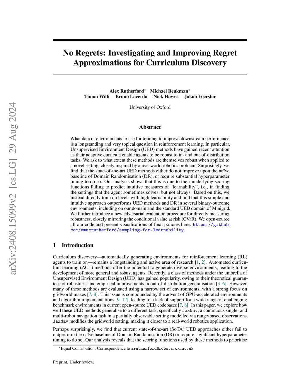 What data or environments to use for training to improve downstream performance is a longstanding and very topical question in reinforcement learning. In particular, Unsupervised Environment Design (UED) methods have gained recent attention as their adaptive curricula enable agents to be robust to in- and out-of-distribution tasks. We ask to what extent these methods are themselves robust when applied to a novel setting, closely inspired by a real-world robotics problem. Surprisingly, we find that the state-of-the-art UED methods either do not improve upon the na\"{i}ve baseline of Domain Randomisation (DR), or require substantial hyperparameter tuning to do so. Our analysis shows that this is due to their underlying scoring functions failing to predict intuitive measures of ``learnability'', i.e., in finding the settings that the agent sometimes solves, but not always. Based on this, we instead directly train on levels with high learnability and find that this simple and intuitive approach outperforms UED methods and DR in several binary-outcome environments, including on our domain and the standard UED domain of Minigrid. We further introduce a new adversarial evaluation procedure for directly measuring robustness, closely mirroring the conditional value at risk (CVaR). We open-source all our code and present visualisations of final policies here: https://github.com/amacrutherford/sampling-for-learnability.