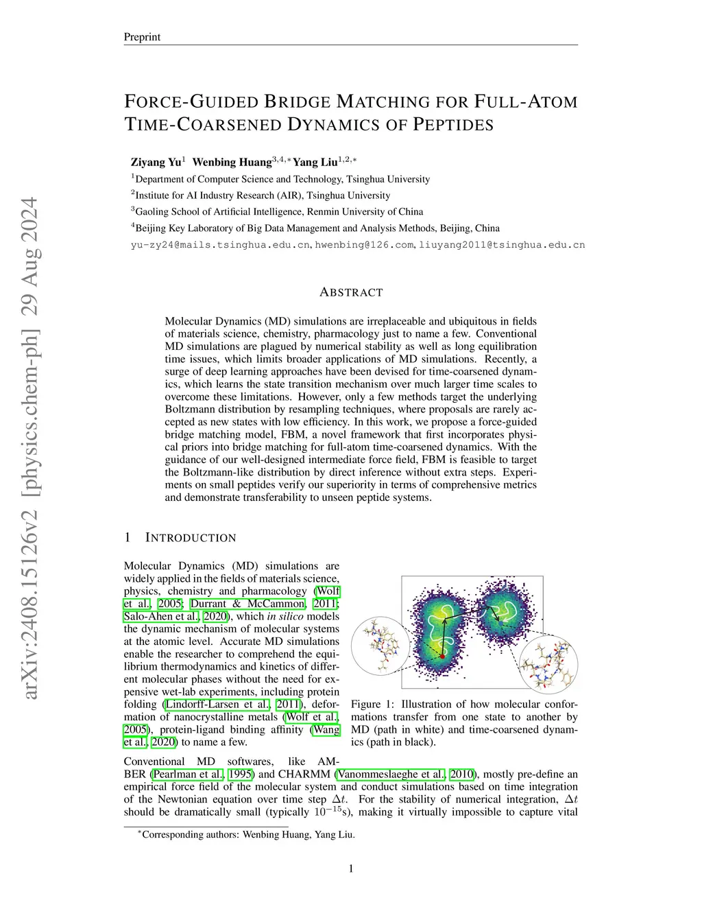 Molecular Dynamics (MD) is crucial in various fields such as materials science, chemistry, and pharmacology to name a few. Conventional MD software struggles with the balance between time cost and prediction accuracy, which restricts its wider application. Recently, data-driven approaches based on deep generative models have been devised for time-coarsened dynamics, which aim at learning dynamics of diverse molecular systems over a long timestep, enjoying both universality and efficiency. Nevertheless, most current methods are designed solely to learn from the data distribution regardless of the underlying Boltzmann distribution, and the physics priors such as energies and forces are constantly overlooked. In this work, we propose a conditional generative model called Force-guided Bridge Matching (FBM), which learns full-atom time-coarsened dynamics and targets the Boltzmann-constrained distribution. With the guidance of our delicately-designed intermediate force field, FBM leverages favourable physics priors into the generation process, giving rise to enhanced simulations. Experiments on two datasets consisting of peptides verify our superiority in terms of comprehensive metrics and demonstrate transferability to unseen systems.