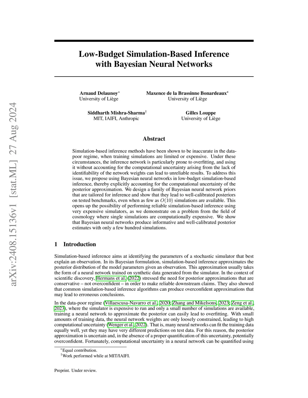 Simulation-based inference methods have been shown to be inaccurate in the data-poor regime, when training simulations are limited or expensive. Under these circumstances, the inference network is particularly prone to overfitting, and using it without accounting for the computational uncertainty arising from the lack of identifiability of the network weights can lead to unreliable results. To address this issue, we propose using Bayesian neural networks in low-budget simulation-based inference, thereby explicitly accounting for the computational uncertainty of the posterior approximation. We design a family of Bayesian neural network priors that are tailored for inference and show that they lead to well-calibrated posteriors on tested benchmarks, even when as few as simulations are available. This opens up the possibility of performing reliable simulation-based inference using very expensive simulators, as we demonstrate on a problem from the field of cosmology where single simulations are computationally expensive. We show that Bayesian neural networks produce informative and well-calibrated posterior estimates with only a few hundred simulations.
