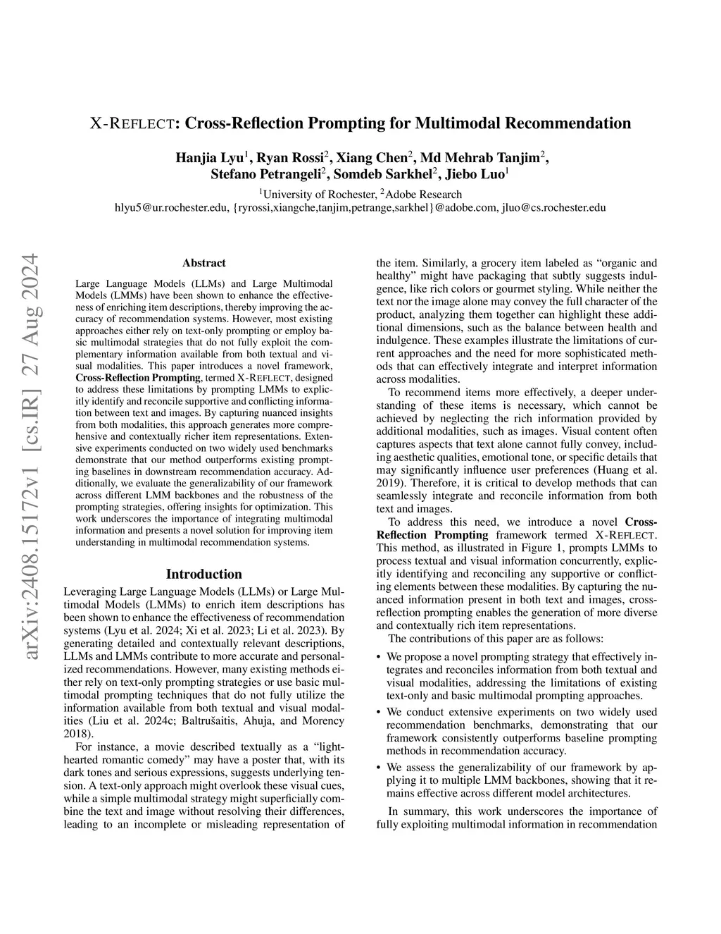 Large Language Models (LLMs) have been shown to enhance the effectiveness of enriching item descriptions, thereby improving the accuracy of recommendation systems. However, most existing approaches either rely on text-only prompting or employ basic multimodal strategies that do not fully exploit the complementary information available from both textual and visual modalities. This paper introduces a novel framework, Cross-Reflection Prompting, termed X-Reflect, designed to address these limitations by prompting Multimodal Large Language Models (MLLMs) to explicitly identify and reconcile supportive and conflicting information between text and images. By capturing nuanced insights from both modalities, this approach generates more comprehensive and contextually rich item representations. Extensive experiments conducted on two widely used benchmarks demonstrate that our method outperforms existing prompting baselines in downstream recommendation accuracy. Furthermore, we identify a U-shaped relationship between text-image dissimilarity and recommendation performance, suggesting the benefit of applying multimodal prompting selectively. To support efficient real-time inference, we also introduce X-Reflect-keyword, a lightweight variant that summarizes image content using keywords and replaces the base model with a smaller backbone, achieving nearly 50% reduction in input length while maintaining competitive performance. This work underscores the importance of integrating multimodal information and presents an effective solution for improving item understanding in multimodal recommendation systems.