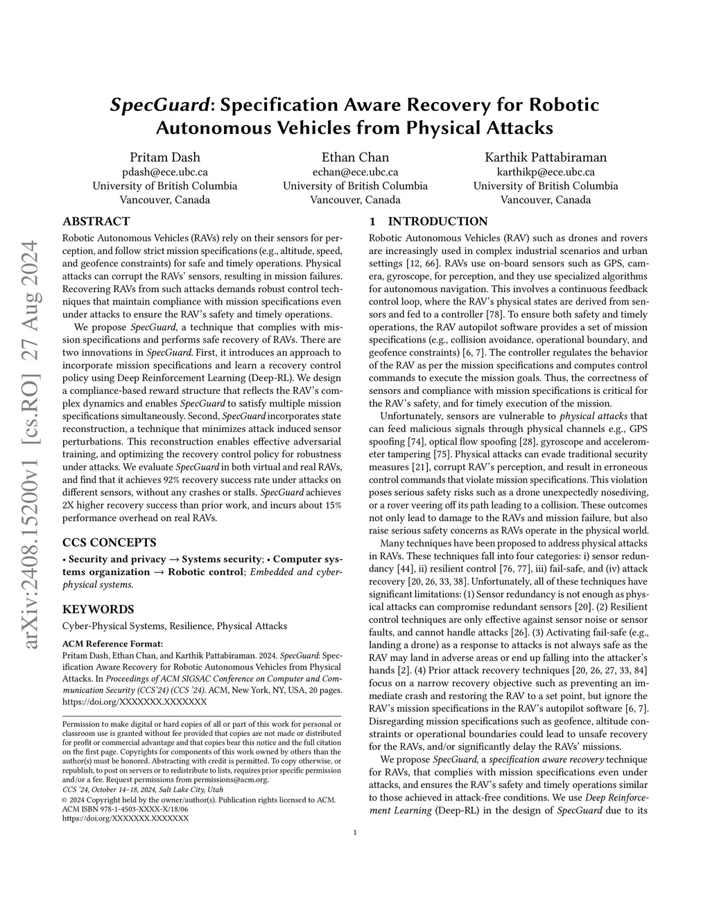 Robotic Autonomous Vehicles (RAVs) rely on their sensors for perception, and follow strict mission specifications (e.g., altitude, speed, and geofence constraints) for safe and timely operations. Physical attacks can corrupt the RAVs' sensors, resulting in mission failures. Recovering RAVs from such attacks demands robust control techniques that maintain compliance with mission specifications even under attacks to ensure the RAV's safety and timely operations. We propose SpecGuard, a technique that complies with mission specifications and performs safe recovery of RAVs. There are two innovations in SpecGuard. First, it introduces an approach to incorporate mission specifications and learn a recovery control policy using Deep Reinforcement Learning (Deep-RL). We design a compliance-based reward structure that reflects the RAV's complex dynamics and enables SpecGuard to satisfy multiple mission specifications simultaneously. Second, SpecGuard incorporates state reconstruction, a technique that minimizes attack induced sensor perturbations. This reconstruction enables effective adversarial training, and optimizing the recovery control policy for robustness under attacks. We evaluate SpecGuard in both virtual and real RAVs, and find that it achieves 92% recovery success rate under attacks on different sensors, without any crashes or stalls. SpecGuard achieves 2X higher recovery success than prior work, and incurs about 15% performance overhead on real RAVs.