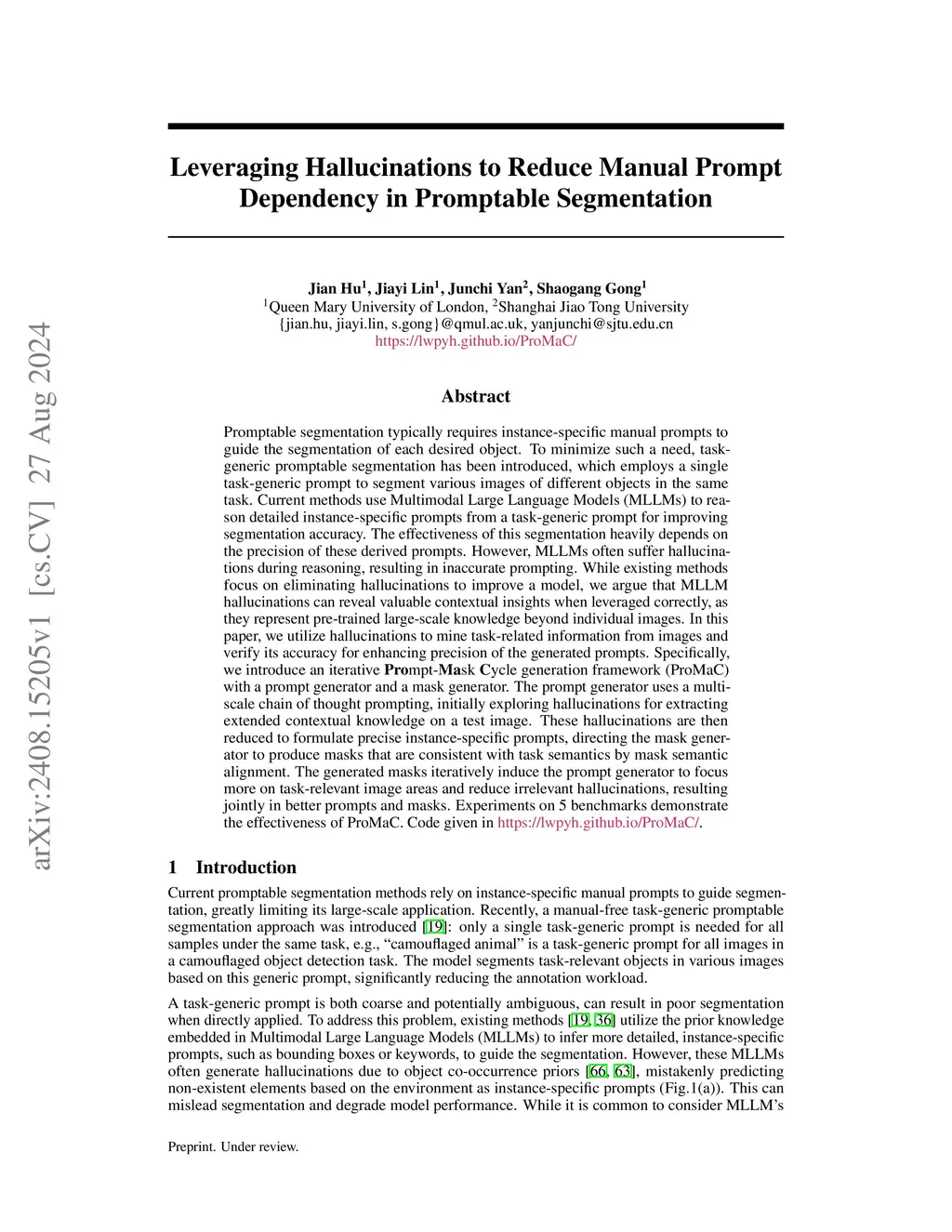 Promptable segmentation typically requires instance-specific manual prompts to guide the segmentation of each desired object. To minimize such a need, task-generic promptable segmentation has been introduced, which employs a single task-generic prompt to segment various images of different objects in the same task. Current methods use Multimodal Large Language Models (MLLMs) to reason detailed instance-specific prompts from a task-generic prompt for improving segmentation accuracy. The effectiveness of this segmentation heavily depends on the precision of these derived prompts. However, MLLMs often suffer hallucinations during reasoning, resulting in inaccurate prompting. While existing methods focus on eliminating hallucinations to improve a model, we argue that MLLM hallucinations can reveal valuable contextual insights when leveraged correctly, as they represent pre-trained large-scale knowledge beyond individual images. In this paper, we utilize hallucinations to mine task-related information from images and verify its accuracy for enhancing precision of the generated prompts. Specifically, we introduce an iterative Prompt-Mask Cycle generation framework (ProMaC) with a prompt generator and a mask generator.The prompt generator uses a multi-scale chain of thought prompting, initially exploring hallucinations for extracting extended contextual knowledge on a test image.These hallucinations are then reduced to formulate precise instance-specific prompts, directing the mask generator to produce masks that are consistent with task semantics by mask semantic alignment. The generated masks iteratively induce the prompt generator to focus more on task-relevant image areas and reduce irrelevant hallucinations, resulting jointly in better prompts and masks. Experiments on 5 benchmarks demonstrate the effectiveness of ProMaC. Code given in https://lwpyh.github.io/ProMaC/.
