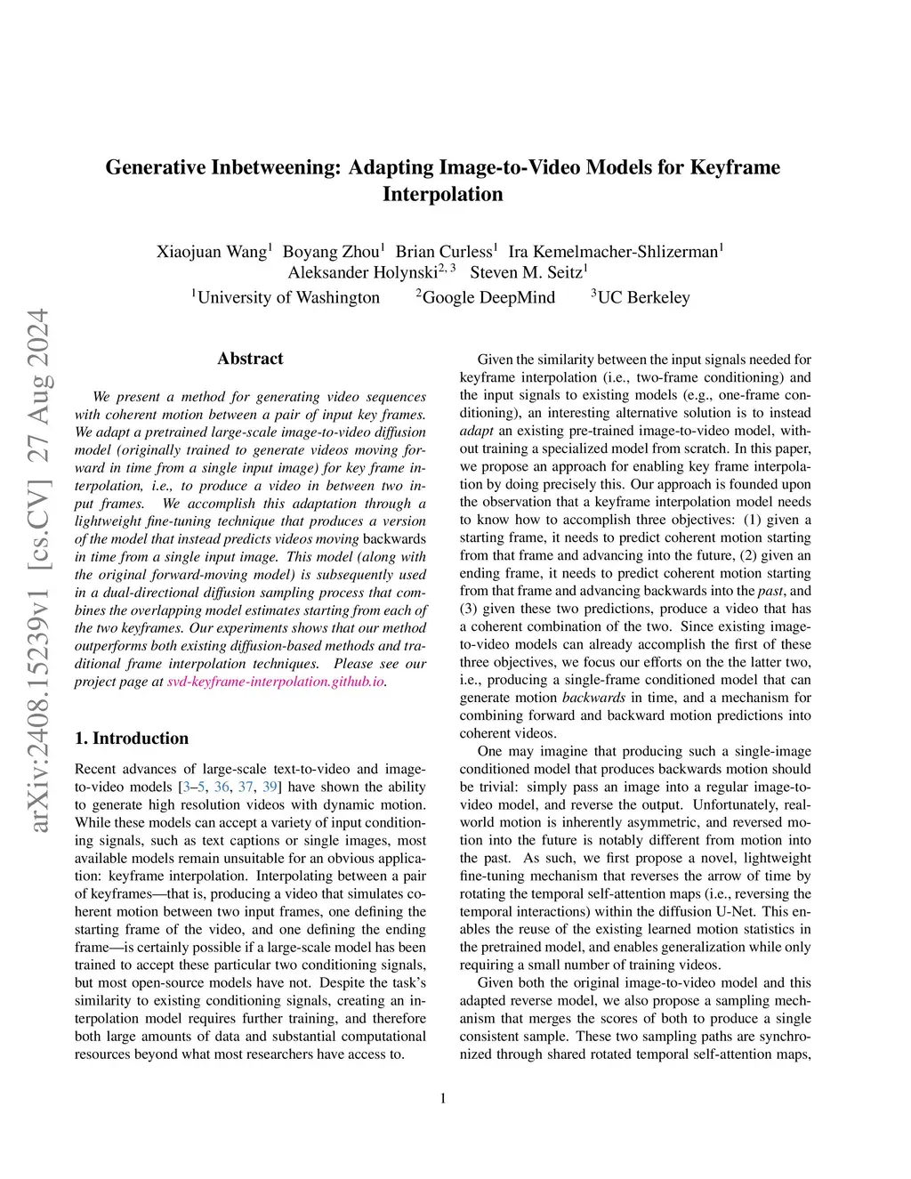 We present a method for generating video sequences with coherent motion between a pair of input key frames. We adapt a pretrained large-scale image-to-video diffusion model (originally trained to generate videos moving forward in time from a single input image) for key frame interpolation, i.e., to produce a video in between two input frames. We accomplish this adaptation through a lightweight fine-tuning technique that produces a version of the model that instead predicts videos moving backwards in time from a single input image. This model (along with the original forward-moving model) is subsequently used in a dual-directional diffusion sampling process that combines the overlapping model estimates starting from each of the two keyframes. Our experiments show that our method outperforms both existing diffusion-based methods and traditional frame interpolation techniques.
