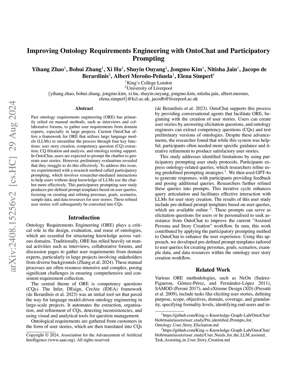 Past ontology requirements engineering (ORE) has primarily relied on manual methods, such as interviews and collaborative forums, to gather user requirements from domain experts, especially in large projects. Current OntoChat offers a framework for ORE that utilises large language models (LLMs) to streamline the process through four key functions: user story creation, competency question (CQ) extraction, CQ filtration and analysis, and ontology testing support. In OntoChat, users are expected to prompt the chatbot to generate user stories. However, preliminary evaluations revealed that they struggle to do this effectively. To address this issue, we experimented with a research method called participatory prompting, which involves researcher-mediated interactions to help users without deep knowledge of LLMs use the chatbot more effectively. This participatory prompting user study produces pre-defined prompt templates based on user queries, focusing on creating and refining personas, goals, scenarios, sample data, and data resources for user stories. These refined user stories will subsequently be converted into CQs.