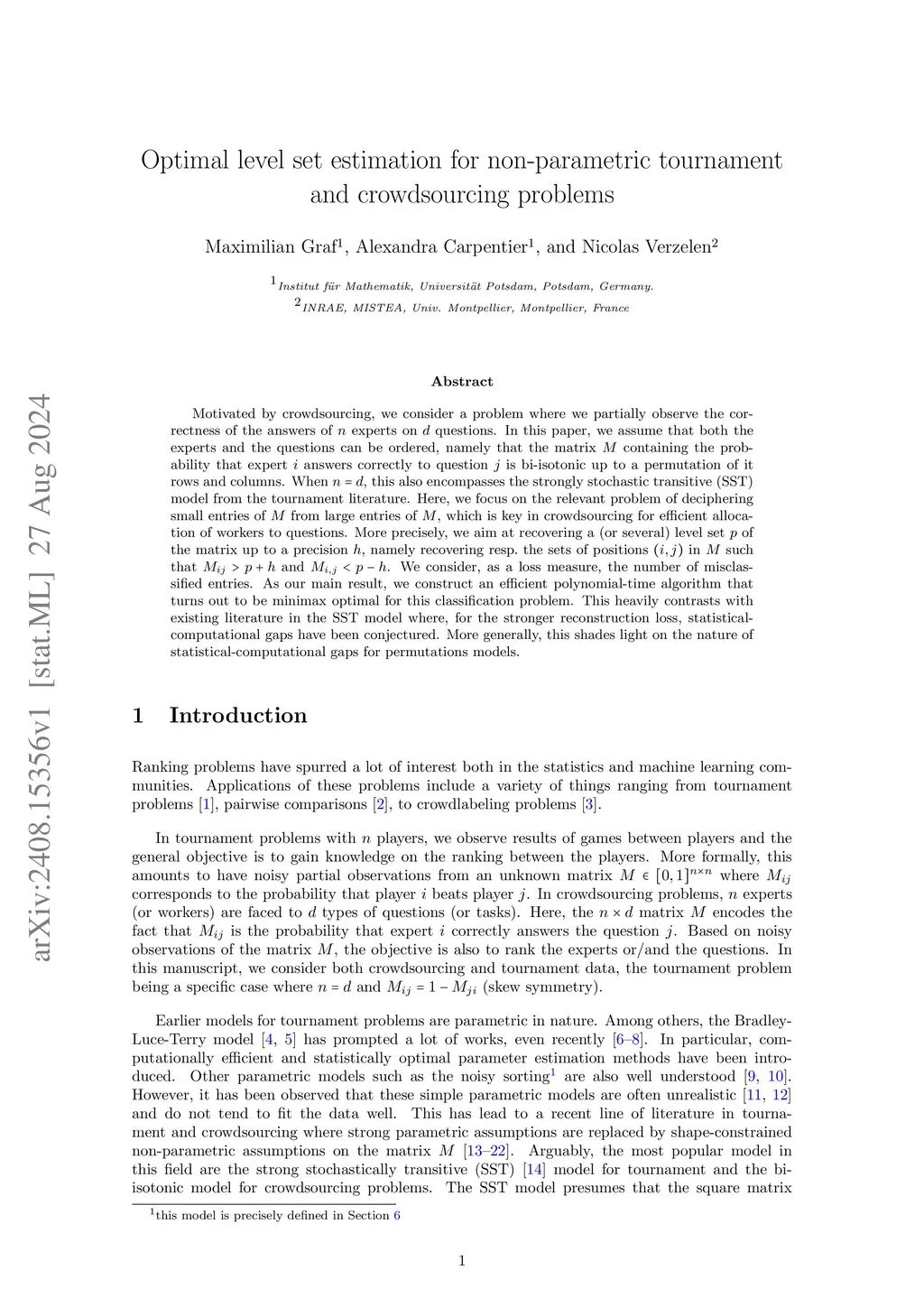 Motivated by crowdsourcing, we consider a problem where we partially observe the correctness of the answers of experts on questions. In this paper, we assume that both the experts and the questions can be ordered, namely that the matrix containing the probability that expert answers correctly to question is bi-isotonic up to a permutation of it rows and columns. When , this also encompasses the strongly stochastic transitive (SST) model from the tournament literature. Here, we focus on the relevant problem of deciphering small entries of from large entries of , which is key in crowdsourcing for efficient allocation of workers to questions. More precisely, we aim at recovering a (or several) level set of the matrix up to a precision , namely recovering resp. the sets of positions in such that and . We consider, as a loss measure, the number of misclassified entries. As our main result, we construct an efficient polynomial-time algorithm that turns out to be minimax optimal for this classification problem. This heavily contrasts with existing literature in the SST model where, for the stronger reconstruction loss, statistical-computational gaps have been conjectured. More generally, this shades light on the nature of statistical-computational gaps for permutations models.