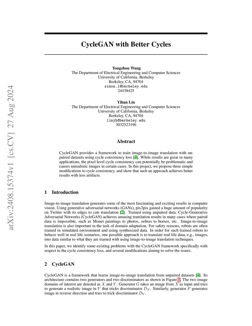 CycleGAN provides a framework to train image-to-image translation with unpaired datasets using cycle consistency loss [4]. While results are great in many applications, the pixel level cycle consistency can potentially be problematic and causes unrealistic images in certain cases. In this project, we propose three simple modifications to cycle consistency, and show that such an approach achieves better results with fewer artifacts.
