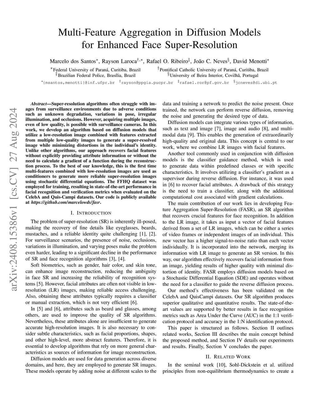 Super-resolution algorithms often struggle with images from surveillance environments due to adverse conditions such as unknown degradation, variations in pose, irregular illumination, and occlusions. However, acquiring multiple images, even of low quality, is possible with surveillance cameras. In this work, we develop an algorithm based on diffusion models that utilize a low-resolution image combined with features extracted from multiple low-quality images to generate a super-resolved image while minimizing distortions in the individual's identity. Unlike other algorithms, our approach recovers facial features without explicitly providing attribute information or without the need to calculate a gradient of a function during the reconstruction process. To the best of our knowledge, this is the first time multi-features combined with low-resolution images are used as conditioners to generate more reliable super-resolution images using stochastic differential equations. The FFHQ dataset was employed for training, resulting in state-of-the-art performance in facial recognition and verification metrics when evaluated on the CelebA and Quis-Campi datasets. Our code is publicly available at https://github.com/marcelowds/fasr