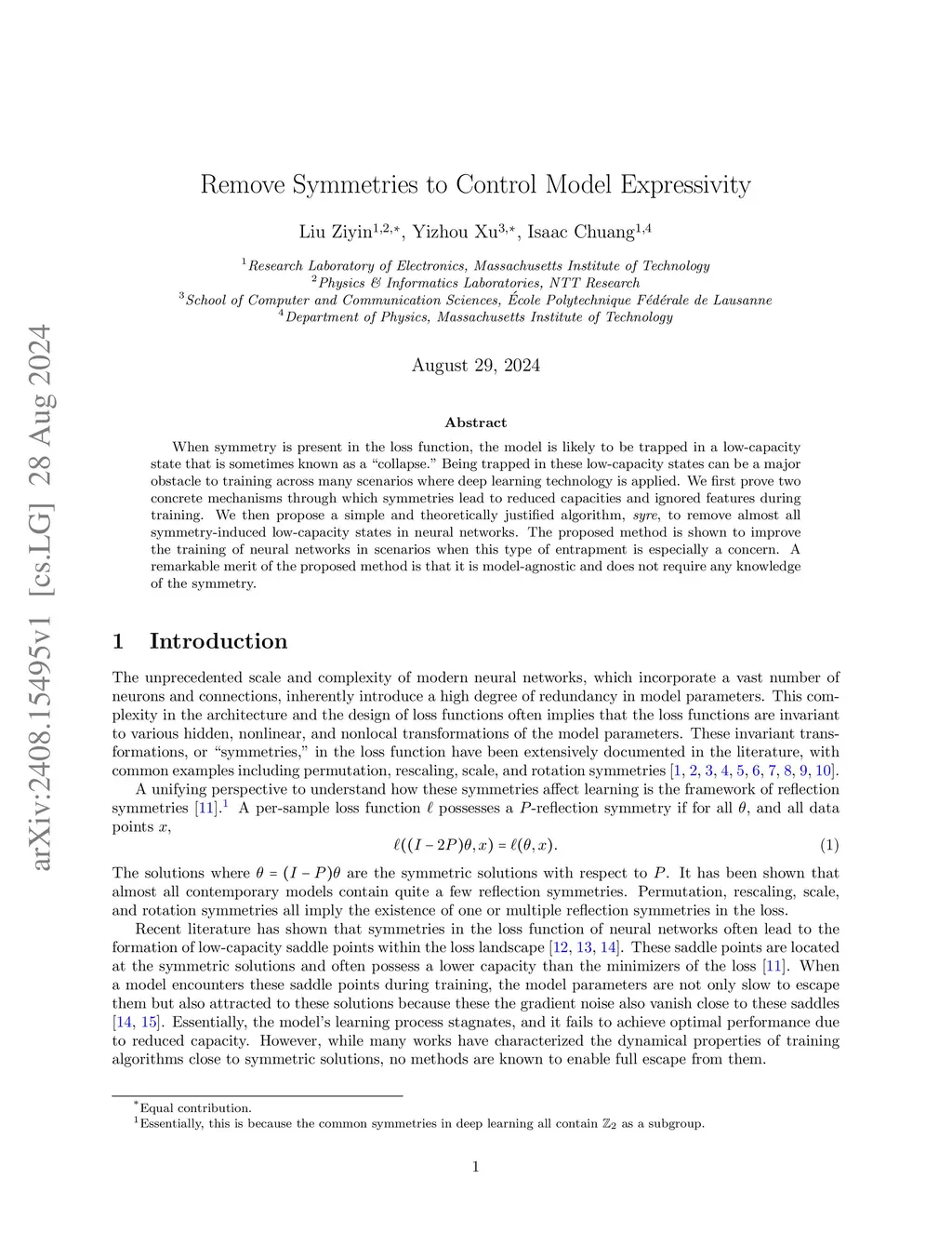 When symmetry is present in the loss function, the model is likely to be trapped in a low-capacity state that is sometimes known as a "collapse". Being trapped in these low-capacity states can be a major obstacle to training across many scenarios where deep learning technology is applied. We first prove two concrete mechanisms through which symmetries lead to reduced capacities and ignored features during training and inference. We then propose a simple and theoretically justified algorithm, syre, to remove almost all symmetry-induced low-capacity states in neural networks. When this type of entrapment is especially a concern, removing symmetries with the proposed method is shown to correlate well with improved optimization or performance. A remarkable merit of the proposed method is that it is model-agnostic and does not require any knowledge of the symmetry.