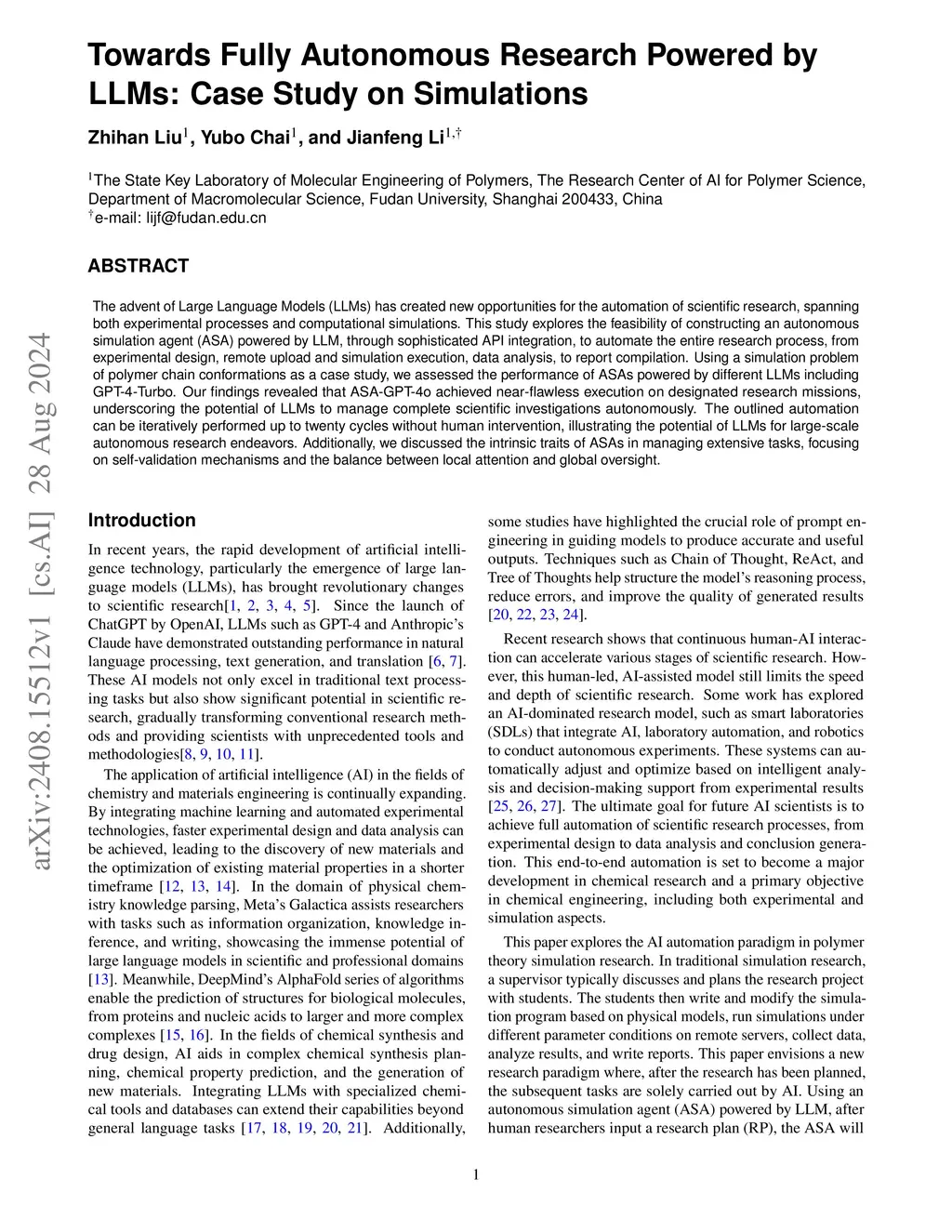 The advent of Large Language Models (LLMs) has created new opportunities for the automation of scientific research spanning both experimental processes and computational simulations. This study explores the feasibility of constructing an autonomous simulation agent (ASA) powered by LLMs through prompt engineering and automated program design to automate the entire simulation research process according to a human-provided research plan. This process includes experimental design, remote upload and simulation execution, data analysis, and report compilation. Using a well-studied simulation problem of polymer chain conformations as a test case, we assessed the long-task completion and reliability of ASAs powered by different LLMs, including GPT-4o, Claude-3.5, etc. Our findings revealed that ASA-GPT-4o achieved near-flawless execution on designated research missions, underscoring the potential of methods like ASA to achieve automation in simulation research processes to enhance research efficiency. The outlined automation can be iteratively performed for up to 20 cycles without human intervention, illustrating the potential of ASA for long-task workflow automation. Additionally, we discussed the intrinsic traits of ASA in managing extensive tasks, focusing on self-validation mechanisms, and the balance between local attention and global oversight.