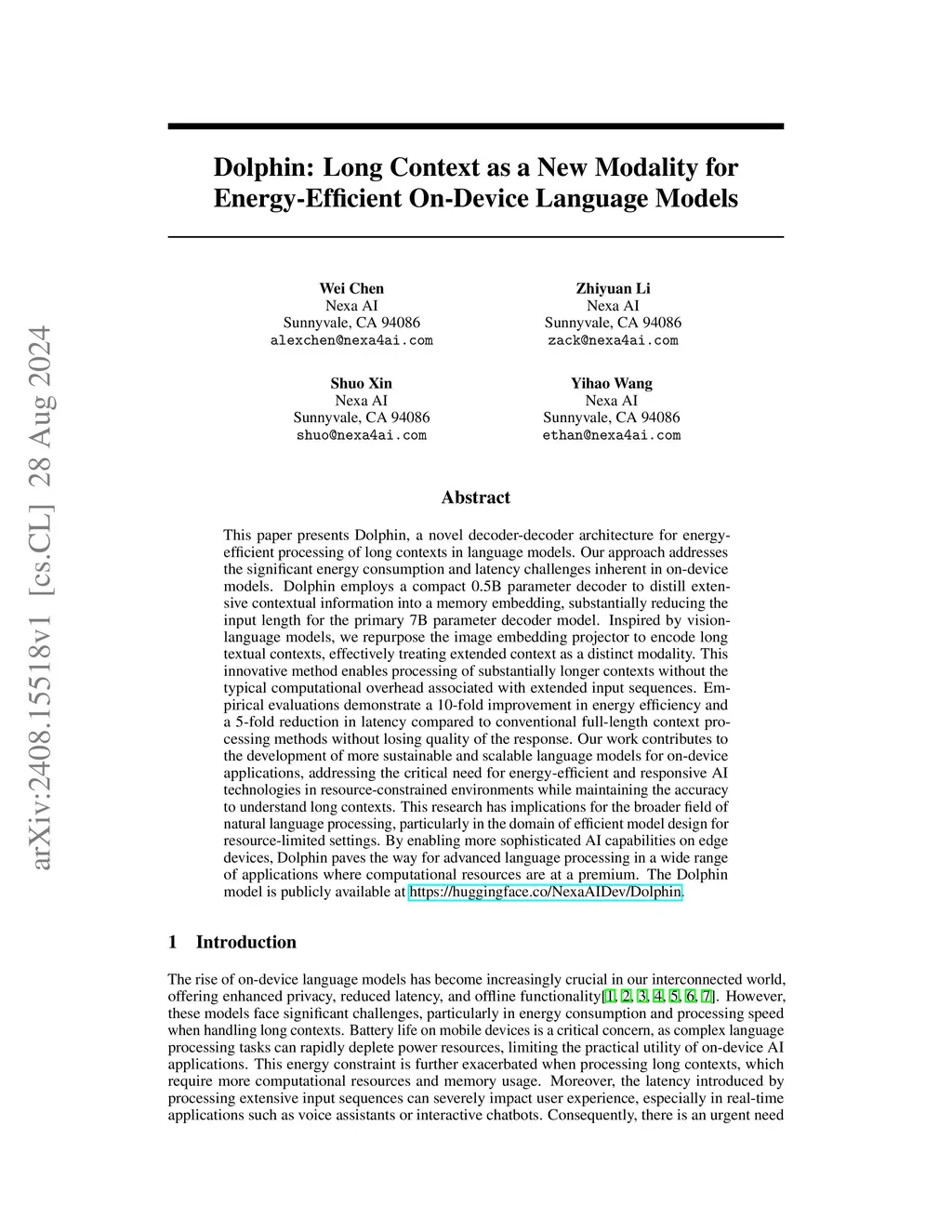 This paper presents Dolphin, a novel decoder-decoder architecture for energy-efficient processing of long contexts in language models. Our approach addresses the significant energy consumption and latency challenges inherent in on-device models. Dolphin employs a compact 0.5B parameter decoder to distill extensive contextual information into a memory embedding, substantially reducing the input length for the primary 7B parameter decoder model. Inspired by vision-language models, we repurpose the image embedding projector to encode long textual contexts, effectively treating extended context as a distinct modality. This innovative method enables processing of substantially longer contexts without the typical computational overhead associated with extended input sequences. Empirical evaluations demonstrate a 10-fold improvement in energy efficiency and a 5-fold reduction in latency compared to conventional full-length context processing methods without losing quality of the response. Our work contributes to the development of more sustainable and scalable language models for on-device applications, addressing the critical need for energy-efficient and responsive AI technologies in resource-constrained environments while maintaining the accuracy to understand long contexts. This research has implications for the broader field of natural language processing, particularly in the domain of efficient model design for resource-limited settings. By enabling more sophisticated AI capabilities on edge devices, Dolphin paves the way for advanced language processing in a wide range of applications where computational resources are at a premium. The Dolphin model is publicly available at https://huggingface.co/NexaAIDev/Dolphin.