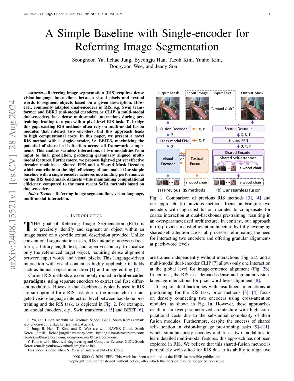 Referring image segmentation (RIS) requires dense vision-language interactions between visual pixels and textual words to segment objects based on a given description. However, commonly adapted dual-encoders in RIS, e.g., Swin transformer and BERT (uni-modal encoders) or CLIP (a multi-modal dual-encoder), lack dense multi-modal interactions during pre-training, leading to a gap with a pixel-level RIS task. To bridge this gap, existing RIS methods often rely on multi-modal fusion modules that interact two encoders, but this approach leads to high computational costs. In this paper, we present a novel RIS method with a single-encoder, i.e., BEiT-3, maximizing the potential of shared self-attention across all framework components. This enables seamless interactions of two modalities from input to final prediction, producing granularly aligned multi-modal features. Furthermore, we propose lightweight yet effective decoder modules, a Shared FPN and a Shared Mask Decoder, which contribute to the high efficiency of our model. Our simple baseline with a single encoder achieves outstanding performances on the RIS benchmark datasets while maintaining computational efficiency, compared to the most recent SoTA methods based on dual-encoders.