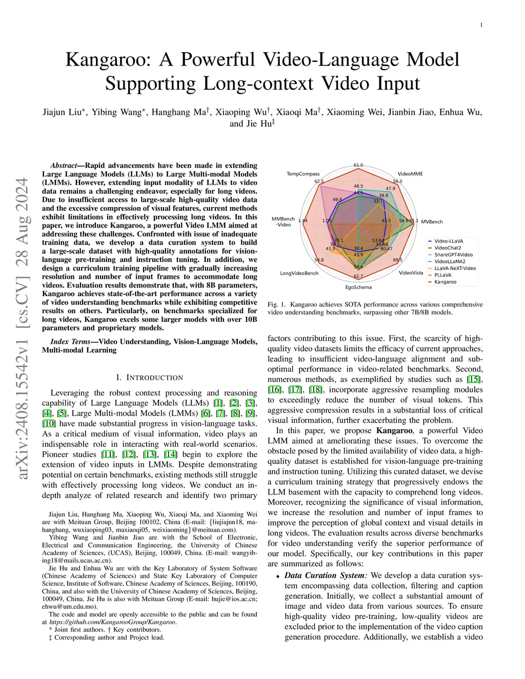 Rapid advancements have been made in extending Large Language Models (LLMs) to Large Multi-modal Models (LMMs). However, extending input modality of LLMs to video data remains a challenging endeavor, especially for long videos. Due to insufficient access to large-scale high-quality video data and the excessive compression of visual features, current methods exhibit limitations in effectively processing long videos. In this paper, we introduce Kangaroo, a powerful Video LMM aimed at addressing these challenges. Confronted with issue of inadequate training data, we develop a data curation system to build a large-scale dataset with high-quality annotations for vision-language pre-training and instruction tuning. In addition, we design a curriculum training pipeline with gradually increasing resolution and number of input frames to accommodate long videos. Evaluation results demonstrate that, with 8B parameters, Kangaroo achieves state-of-the-art performance across a variety of video understanding benchmarks while exhibiting competitive results on others. Particularly, on benchmarks specialized for long videos, Kangaroo excels some larger models with over 10B parameters and proprietary models.