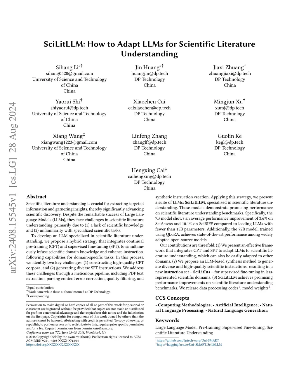 Scientific literature understanding is crucial for extracting targeted information and garnering insights, thereby significantly advancing scientific discovery. Despite the remarkable success of Large Language Models (LLMs), they face challenges in scientific literature understanding, primarily due to (1) a lack of scientific knowledge and (2) unfamiliarity with specialized scientific tasks.To develop an LLM specialized in scientific literature understanding, we propose a hybrid strategy that integrates continual pre-training (CPT) and supervised fine-tuning (SFT), to simultaneously infuse scientific domain knowledge and enhance instruction-following capabilities for domain-specificthis http URLthis process, we identify two key challenges: (1) constructing high-quality CPT corpora, and (2) generating diverse SFT instructions. We address these challenges through a meticulous pipeline, including PDF text extraction, parsing content error correction, quality filtering, and synthetic instruction creation. Applying this strategy, we present a suite of LLMs: SciLitLLM, specialized in scientific literature understanding. These models demonstrate promising performance on scientific literature understanding benchmarks.Our contributions are threefold: (1) We present an effective framework that integrates CPT and SFT to adapt LLMs to scientific literature understanding, which can also be easily adapted to other domains. (2) We propose an LLM-based synthesis method to generate diverse and high-quality scientific instructions, resulting in a new instruction set -- SciLitIns -- for supervised fine-tuning in less-represented scientific domains. (3) SciLitLLM achieves promising performance improvements on scientific literature understanding benchmarks.