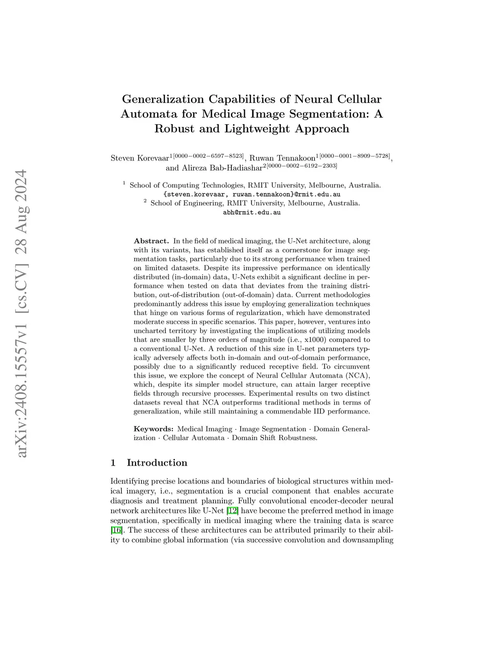 In the field of medical imaging, the U-Net architecture, along with its variants, has established itself as a cornerstone for image segmentation tasks, particularly due to its strong performance when trained on limited datasets. Despite its impressive performance on identically distributed (in-domain) data, U-Nets exhibit a significant decline in performance when tested on data that deviates from the training distribution, out-of-distribution (out-of-domain) data. Current methodologies predominantly address this issue by employing generalization techniques that hinge on various forms of regularization, which have demonstrated moderate success in specific scenarios. This paper, however, ventures into uncharted territory by investigating the implications of utilizing models that are smaller by three orders of magnitude (i.e., x1000) compared to a conventional U-Net. A reduction of this size in U-net parameters typically adversely affects both in-domain and out-of-domain performance, possibly due to a significantly reduced receptive field. To circumvent this issue, we explore the concept of Neural Cellular Automata (NCA), which, despite its simpler model structure, can attain larger receptive fields through recursive processes. Experimental results on two distinct datasets reveal that NCA outperforms traditional methods in terms of generalization, while still maintaining a commendable IID performance.