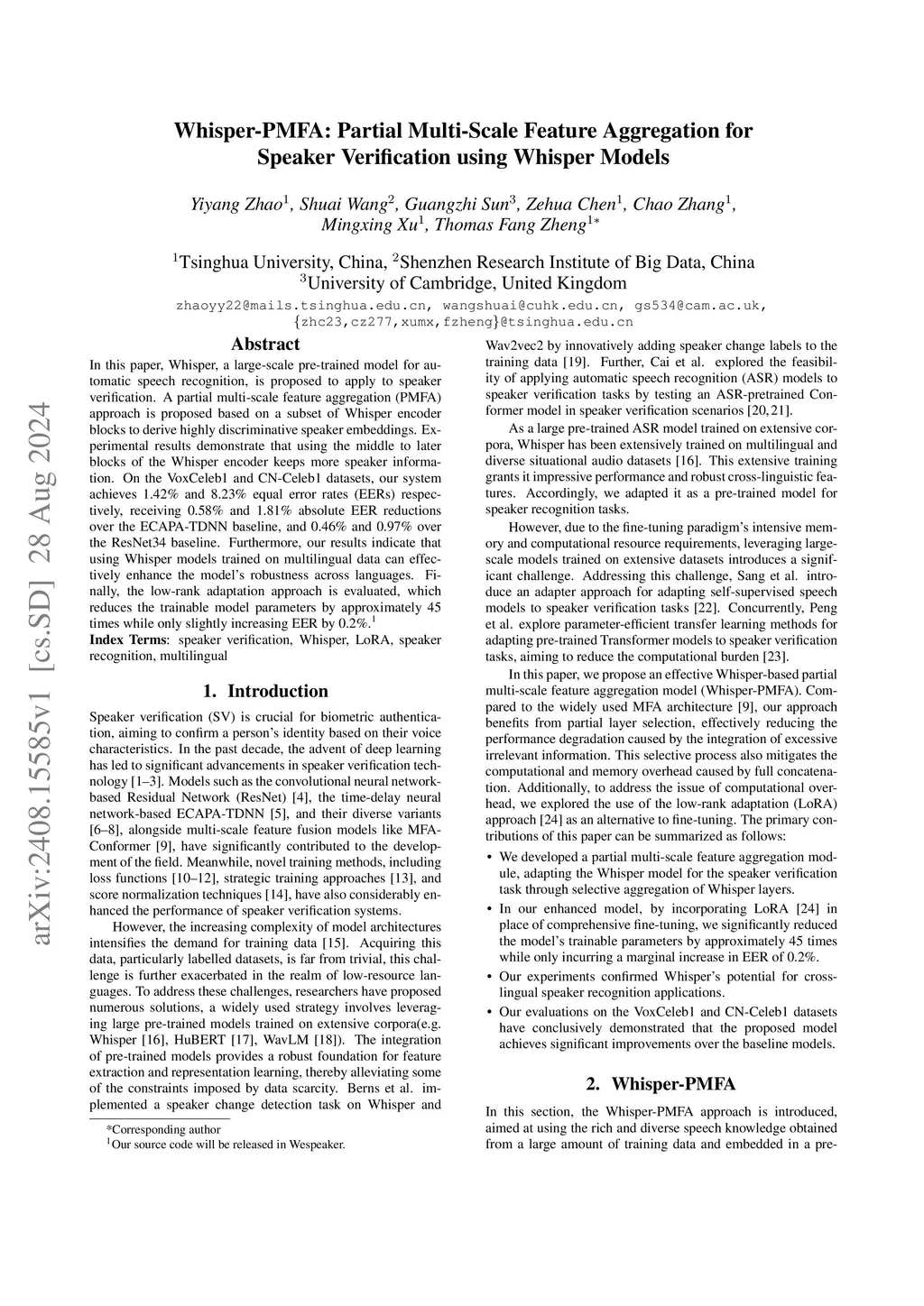 In this paper, Whisper, a large-scale pre-trained model for automatic speech recognition, is proposed to apply to speaker verification. A partial multi-scale feature aggregation (PMFA) approach is proposed based on a subset of Whisper encoder blocks to derive highly discriminative speaker embeddings.Experimental results demonstrate that using the middle to later blocks of the Whisper encoder keeps more speaker information. On the VoxCeleb1 and CN-Celeb1 datasets, our system achieves 1.42% and 8.23% equal error rates (EERs) respectively, receiving 0.58% and 1.81% absolute EER reductions over the ECAPA-TDNN baseline, and 0.46% and 0.97% over the ResNet34 baseline. Furthermore, our results indicate that using Whisper models trained on multilingual data can effectively enhance the model's robustness across languages. Finally, the low-rank adaptation approach is evaluated, which reduces the trainable model parameters by approximately 45 times while only slightly increasing EER by 0.2%.