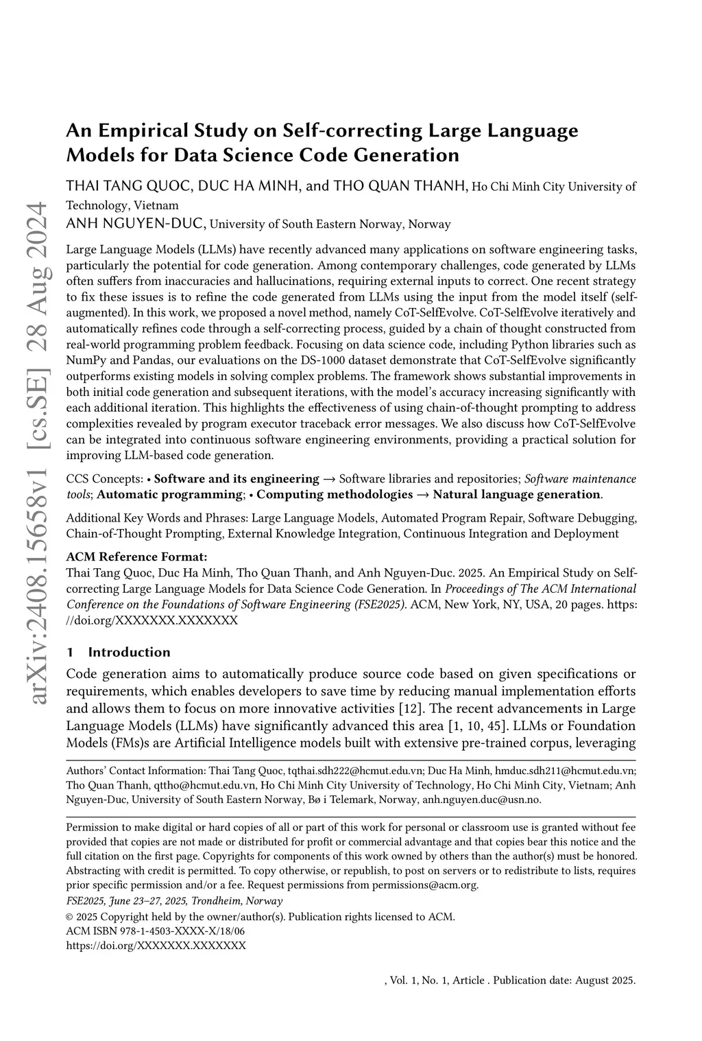 Large Language Models (LLMs) have recently advanced many applications on software engineering tasks, particularly the potential for code generation. Among contemporary challenges, code generated by LLMs often suffers from inaccuracies and hallucinations, requiring external inputs to correct. One recent strategy to fix these issues is to refine the code generated from LLMs using the input from the model itself (self-augmented). In this work, we proposed a novel method, namely CoT-SelfEvolve. CoT-SelfEvolve iteratively and automatically refines code through a self-correcting process, guided by a chain of thought constructed from real-world programming problem feedback. Focusing on data science code, including Python libraries such as NumPy and Pandas, our evaluations on the DS-1000 dataset demonstrate that CoT-SelfEvolve significantly outperforms existing models in solving complex problems. The framework shows substantial improvements in both initial code generation and subsequent iterations, with the model's accuracy increasing significantly with each additional iteration. This highlights the effectiveness of using chain-of-thought prompting to address complexities revealed by program executor traceback error messages. We also discuss how CoT-SelfEvolve can be integrated into continuous software engineering environments, providing a practical solution for improving LLM-based code generation.