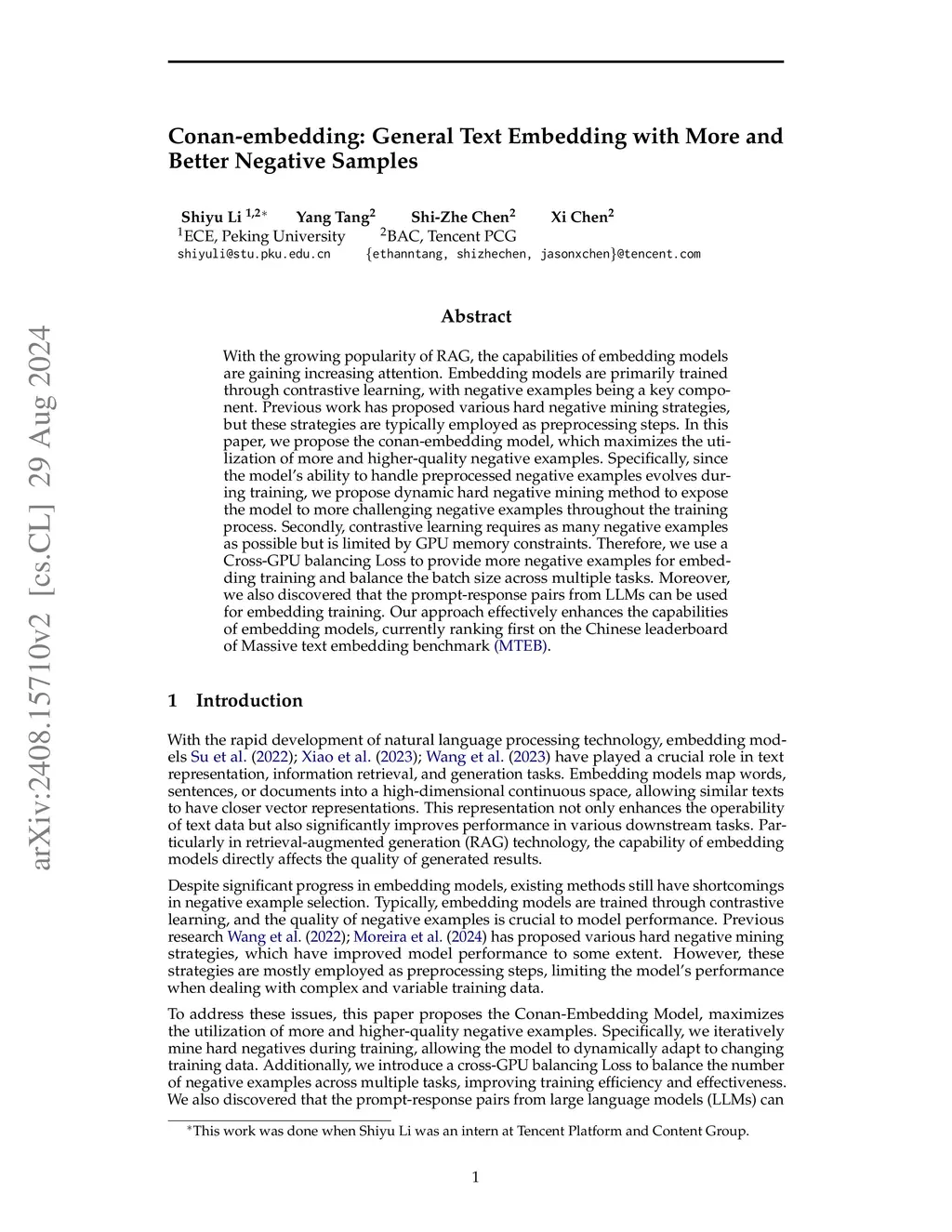 With the growing popularity of RAG, the capabilities of embedding models are gaining increasing attention. Embedding models are primarily trained through contrastive loss learning, with negative examples being a key component. Previous work has proposed various hard negative mining strategies, but these strategies are typically employed as preprocessing steps. In this paper, we propose the conan-embedding model, which maximizes the utilization of more and higher-quality negative examples. Specifically, since the model's ability to handle preprocessed negative examples evolves during training, we propose dynamic hard negative mining method to expose the model to more challenging negative examples throughout the training process. Secondly, contrastive learning requires as many negative examples as possible but is limited by GPU memory constraints. Therefore, we use a Cross-GPU balancing Loss to provide more negative examples for embedding training and balance the batch size across multiple tasks. Moreover, we also discovered that the prompt-response pairs from LLMs can be used for embedding training. Our approach effectively enhances the capabilities of embedding models, currently ranking first on the Chinese leaderboard of Massive text embedding benchmark