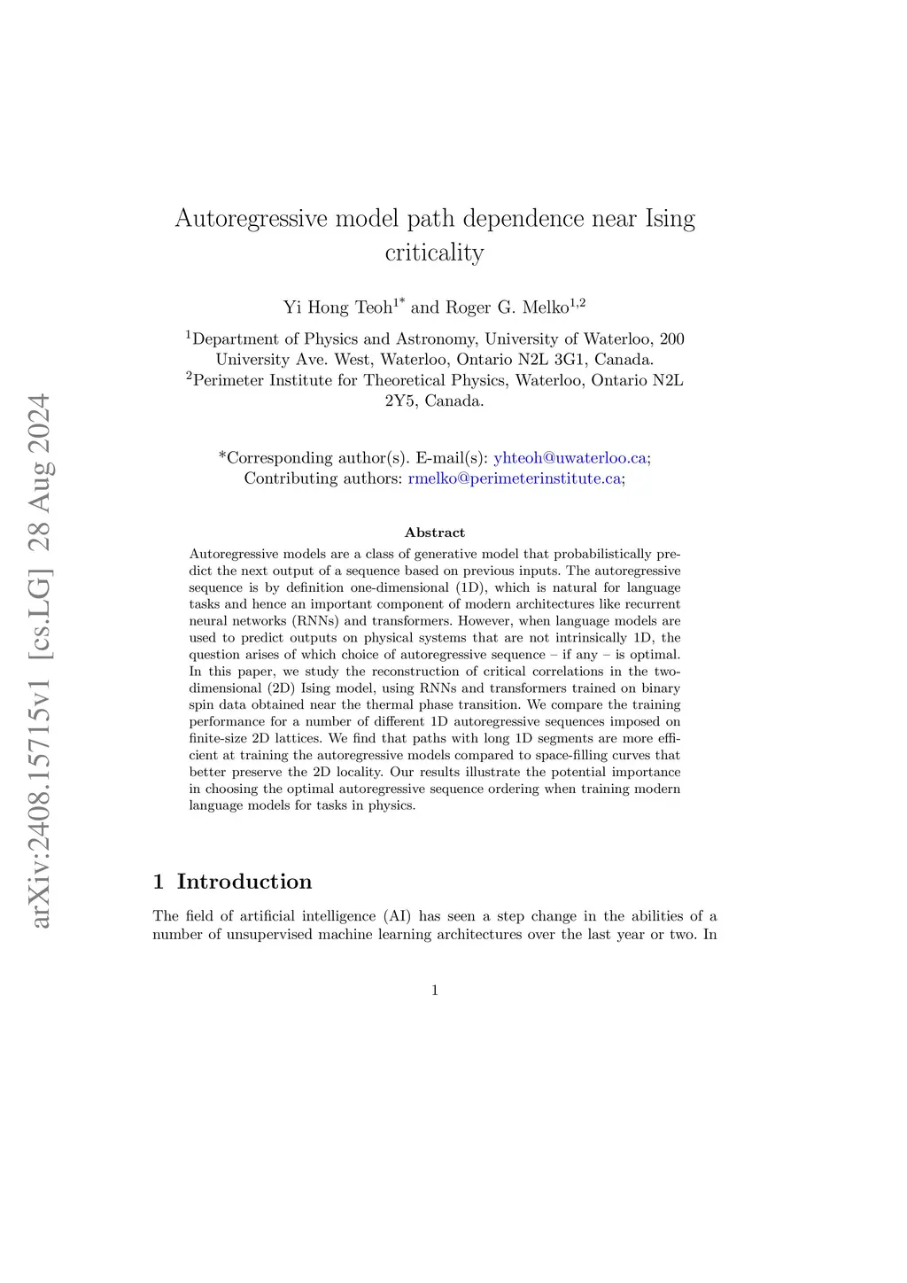 Autoregressive models are a class of generative model that probabilistically predict the next output of a sequence based on previous inputs. The autoregressive sequence is by definition one-dimensional (1D), which is natural for language tasks and hence an important component of modern architectures like recurrent neural networks (RNNs) and transformers. However, when language models are used to predict outputs on physical systems that are not intrinsically 1D, the question arises of which choice of autoregressive sequence -- if any -- is optimal. In this paper, we study the reconstruction of critical correlations in the two-dimensional (2D) Ising model, using RNNs and transformers trained on binary spin data obtained near the thermal phase transition. We compare the training performance for a number of different 1D autoregressive sequences imposed on finite-size 2D lattices. We find that paths with long 1D segments are more efficient at training the autoregressive models compared to space-filling curves that better preserve the 2D locality. Our results illustrate the potential importance in choosing the optimal autoregressive sequence ordering when training modern language models for tasks in physics.