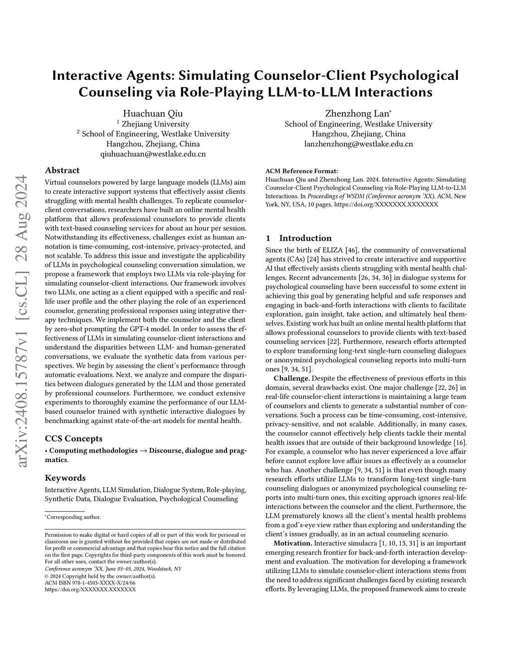 Interactive Agents: Simulating Counselor-Client Psychological Counseling