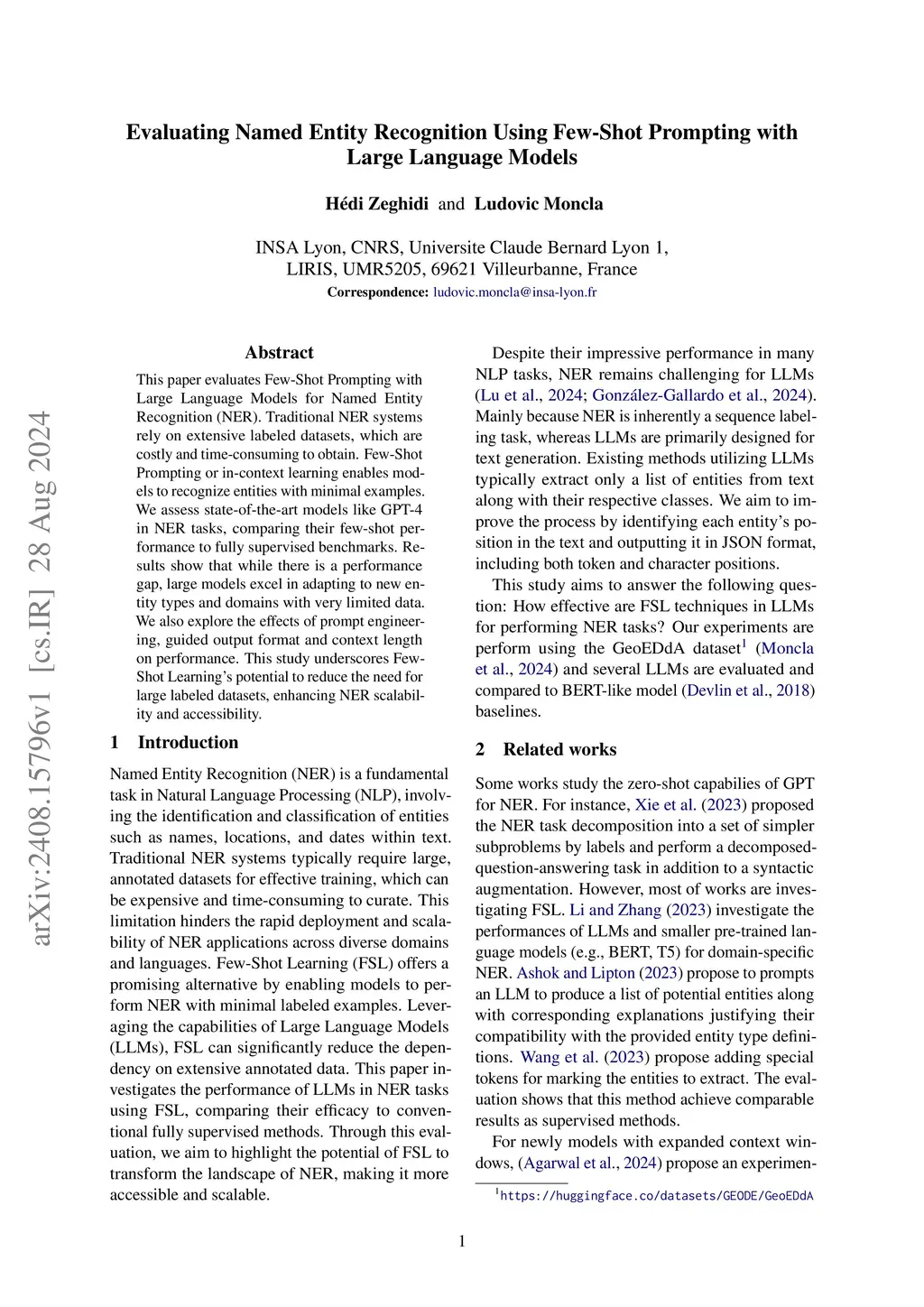 This paper evaluates Few-Shot Prompting with Large Language Models for Named Entity Recognition (NER). Traditional NER systems rely on extensive labeled datasets, which are costly and time-consuming to obtain. Few-Shot Prompting or in-context learning enables models to recognize entities with minimal examples. We assess state-of-the-art models like GPT-4 in NER tasks, comparing their few-shot performance to fully supervised benchmarks. Results show that while there is a performance gap, large models excel in adapting to new entity types and domains with very limited data. We also explore the effects of prompt engineering, guided output format and context length on performance. This study underscores Few-Shot Learning's potential to reduce the need for large labeled datasets, enhancing NER scalability and accessibility.