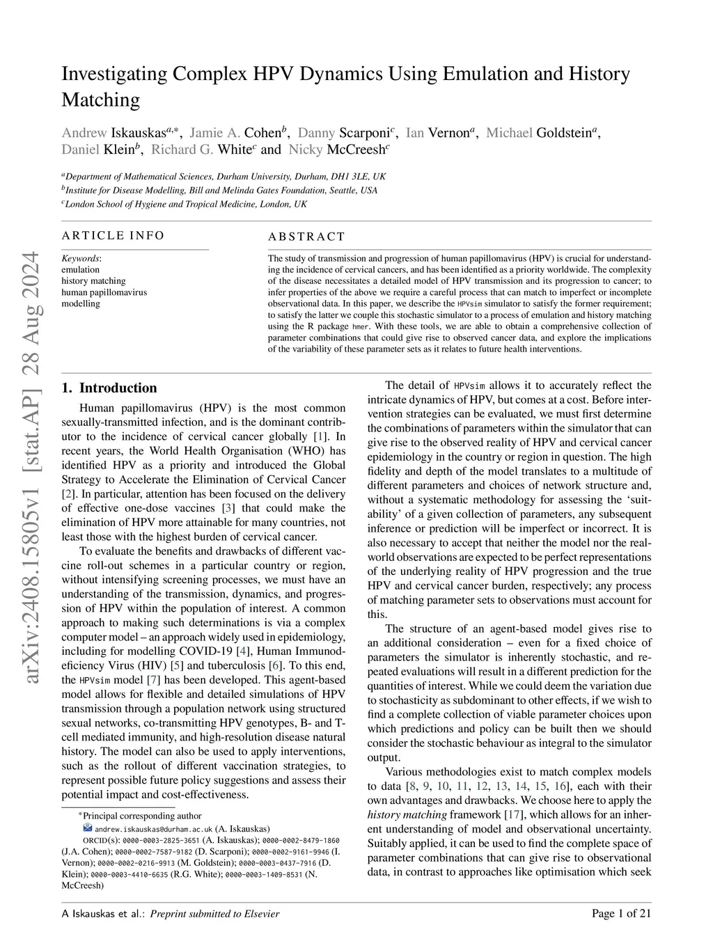 The study of transmission and progression of human papillomavirus (HPV) is crucial for understanding the incidence of cervical cancers, and has been identified as a priority worldwide. The complexity of the disease necessitates a detailed model of HPV transmission and its progression to cancer; to infer properties of the above we require a careful process that can match to imperfect or incomplete observational data. In this paper, we describe the HPVsim simulator to satisfy the former requirement; to satisfy the latter we couple this stochastic simulator to a process of emulation and history matching using the R package hmer. With these tools, we are able to obtain a comprehensive collection of parameter combinations that could give rise to observed cancer data, and explore the implications of the variability of these parameter sets as it relates to future health interventions.