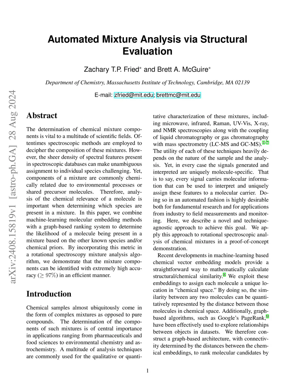 The determination of chemical mixture components is vital to a multitude of scientific fields. Oftentimes spectroscopic methods are employed to decipher the composition of these mixtures. However, the sheer density of spectral features present in spectroscopic databases can make unambiguous assignment to individual species challenging. Yet, components of a mixture are commonly chemically related due to environmental processes or shared precursor molecules. Therefore, analysis of the chemical relevance of a molecule is important when determining which species are present in a mixture. In this paper, we combine machine-learning molecular embedding methods with a graph-based ranking system to determine the likelihood of a molecule being present in a mixture based on the other known species and/or chemical priors. By incorporating this metric in a rotational spectroscopy mixture analysis algorithm, we demonstrate that the mixture components can be identified with extremely high accuracy (>97%) in an efficient manner.