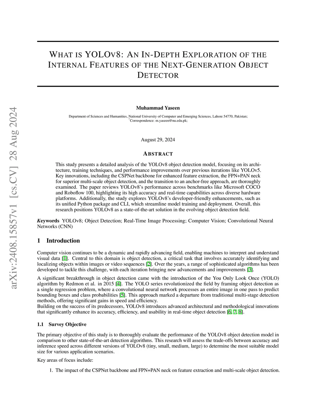 This study presents a detailed analysis of the YOLOv8 object detection model, focusing on its architecture, training techniques, and performance improvements over previous iterations like YOLOv5. Key innovations, including the CSPNet backbone for enhanced feature extraction, the FPN+PAN neck for superior multi-scale object detection, and the transition to an anchor-free approach, are thoroughly examined. The paper reviews YOLOv8's performance across benchmarks like Microsoft COCO and Roboflow 100, highlighting its high accuracy and real-time capabilities across diverse hardware platforms. Additionally, the study explores YOLOv8's developer-friendly enhancements, such as its unified Python package and CLI, which streamline model training and deployment. Overall, this research positions YOLOv8 as a state-of-the-art solution in the evolving object detection field.