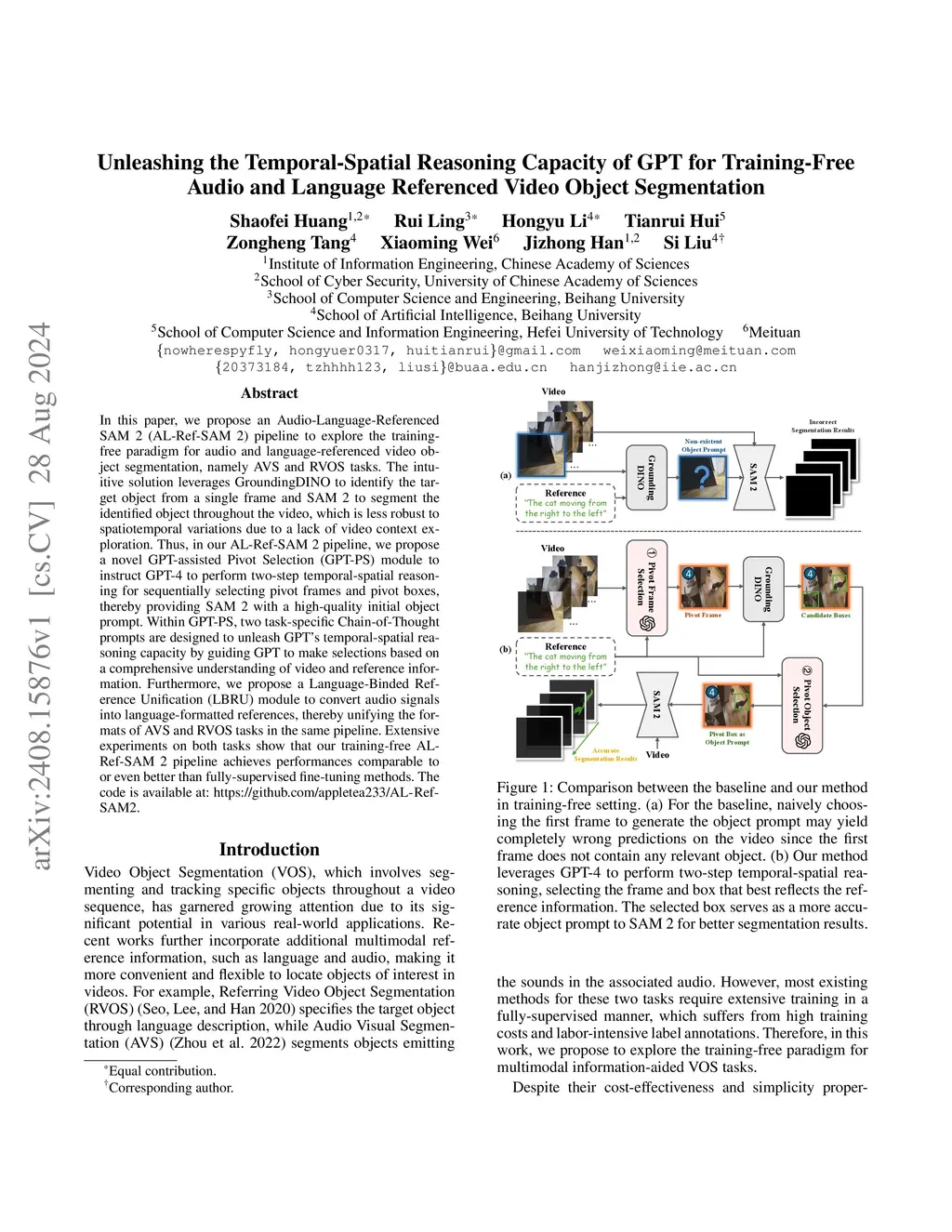 In this paper, we propose an Audio-Language-Referenced SAM 2 (AL-Ref-SAM 2) pipeline to explore the training-free paradigm for audio and language-referenced video object segmentation, namely AVS and RVOS tasks. The intuitive solution leverages GroundingDINO to identify the target object from a single frame and SAM 2 to segment the identified object throughout the video, which is less robust to spatiotemporal variations due to a lack of video context exploration. Thus, in our AL-Ref-SAM 2 pipeline, we propose a novel GPT-assisted Pivot Selection (GPT-PS) module to instruct GPT-4 to perform two-step temporal-spatial reasoning for sequentially selecting pivot frames and pivot boxes, thereby providing SAM 2 with a high-quality initial object prompt. Within GPT-PS, two task-specific Chain-of-Thought prompts are designed to unleash GPT's temporal-spatial reasoning capacity by guiding GPT to make selections based on a comprehensive understanding of video and reference information. Furthermore, we propose a Language-Binded Reference Unification (LBRU) module to convert audio signals into language-formatted references, thereby unifying the formats of AVS and RVOS tasks in the same pipeline. Extensive experiments on both tasks show that our training-free AL-Ref-SAM 2 pipeline achieves performances comparable to or even better than fully-supervised fine-tuning methods. The code is available at: https://github.com/appletea233/AL-Ref-SAM2.