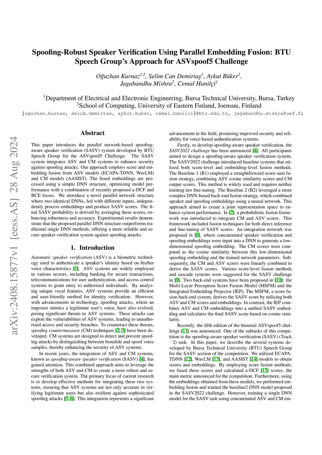This paper introduces the parallel network-based spoofing-aware speaker verification (SASV) system developed by BTU Speech Group for the ASVspoof5 Challenge. The SASV system integrates ASV and CM systems to enhance security against spoofing attacks. Our approach employs score and embedding fusion from ASV models (ECAPA-TDNN, WavLM) and CM models (AASIST). The fused embeddings are processed using a simple DNN structure, optimizing model performance with a combination of recently proposed a-DCF and BCE losses. We introduce a novel parallel network structure where two identical DNNs, fed with different inputs, independently process embeddings and produce SASV scores. The final SASV probability is derived by averaging these scores, enhancing robustness and accuracy. Experimental results demonstrate that the proposed parallel DNN structure outperforms traditional single DNN methods, offering a more reliable and secure speaker verification system against spoofing attacks.