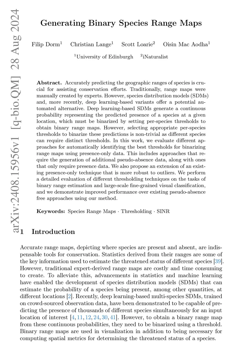 Accurately predicting the geographic ranges of species is crucial for assisting conservation efforts. Traditionally, range maps were manually created by experts. However, species distribution models (SDMs) and, more recently, deep learning-based variants offer a potential automated alternative. Deep learning-based SDMs generate a continuous probability representing the predicted presence of a species at a given location, which must be binarized by setting per-species thresholds to obtain binary range maps. However, selecting appropriate per-species thresholds to binarize these predictions is non-trivial as different species can require distinct thresholds. In this work, we evaluate different approaches for automatically identifying the best thresholds for binarizing range maps using presence-only data. This includes approaches that require the generation of additional pseudo-absence data, along with ones that only require presence data. We also propose an extension of an existing presence-only technique that is more robust to outliers. We perform a detailed evaluation of different thresholding techniques on the tasks of binary range estimation and large-scale fine-grained visual classification, and we demonstrate improved performance over existing pseudo-absence free approaches using our method.